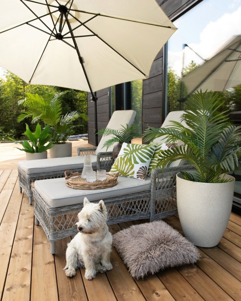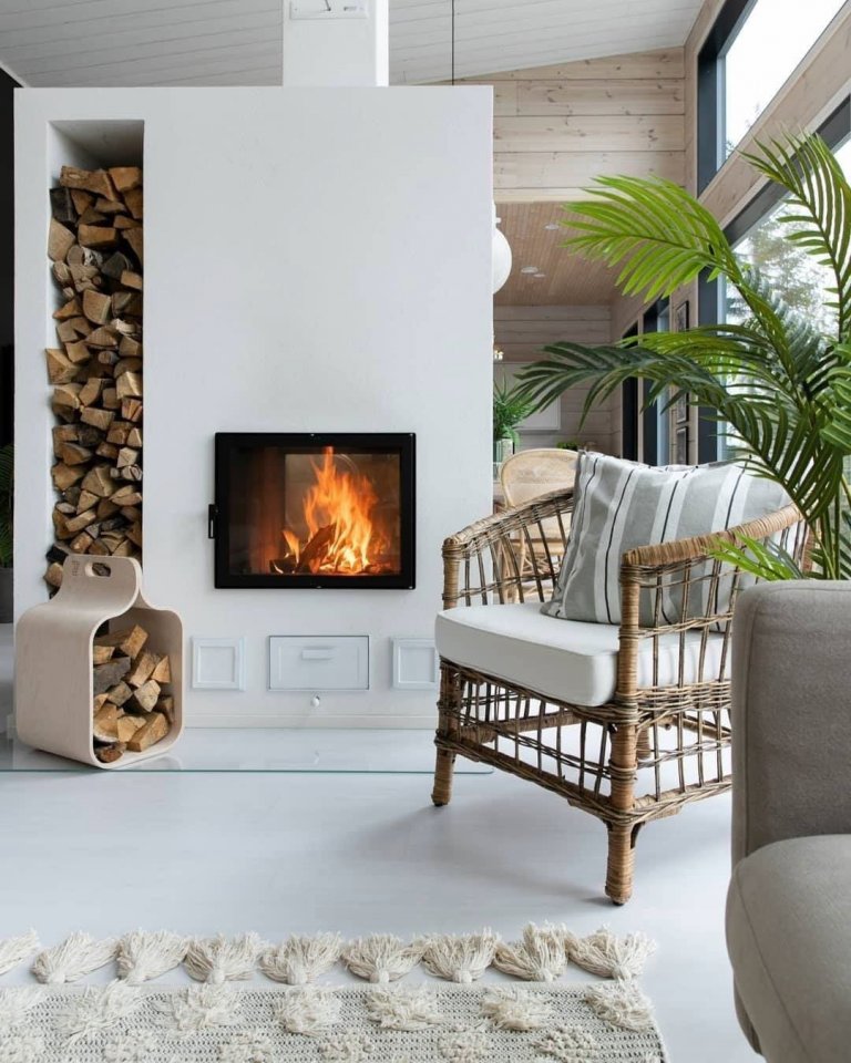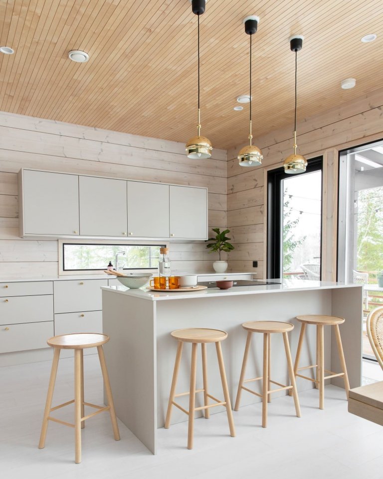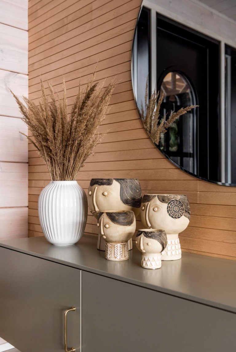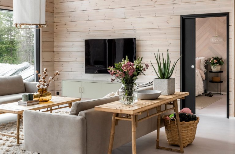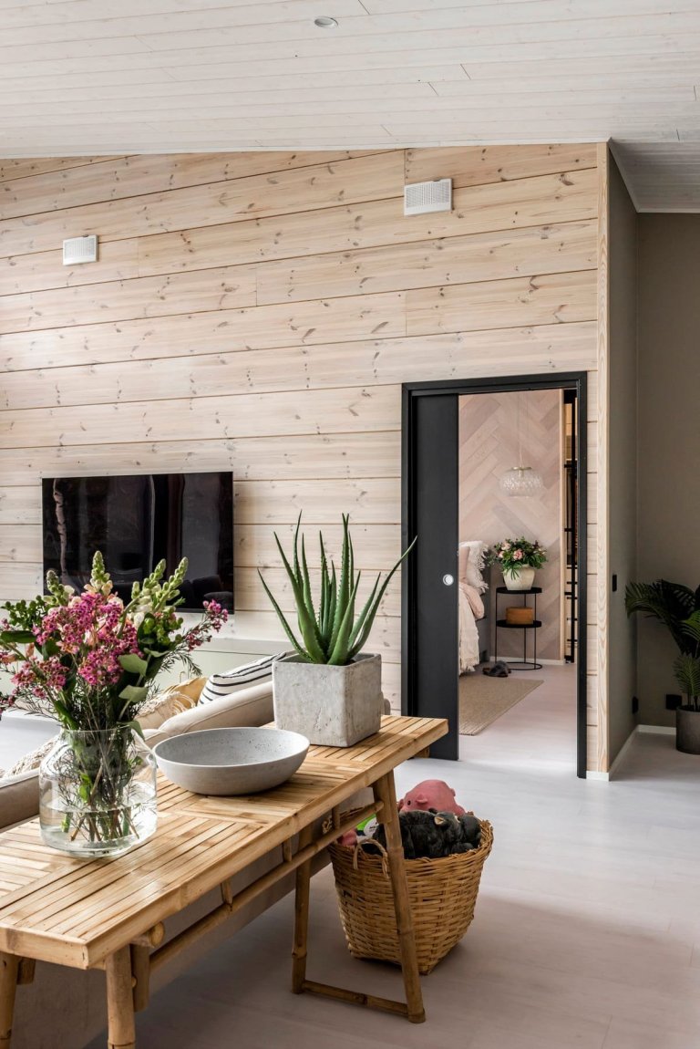 V interiéru dřevostavby se vkusně mísí několik stylů. Vévodí jim moderní, klasický a retro styl. Podle Jenni jsou totiž nejzajímavějšími interiéry právě ty, které jsou vytvořeny kombinací zdánlivě nesourodých stylů. Sama se zde snažila skloubit svou oblibu v texturách a čistých liniích. Miluje něžné detaily, dekorativní polštáře, vzorované koberce, originální lampy a květiny. To všechno se odrazilo i v jejím novém domově. Podobně jako zmíněné prvky zde zajímavě propojila také různé materiály, jako je ratan, dřevo a betonové povrchy. Poněkud drsnější dotek a nádech stylu retro byl do interiéru přidán v podobě rohoží a vzorovaných polštářů. Vyrovnává je nábytek s hladkým povrchem, betonové prvky a velké podlahové dlaždice na chodbě. Všude v domácnosti byly položeny bílé vinylové parkety, které dobře odolávají psím tlapkám.