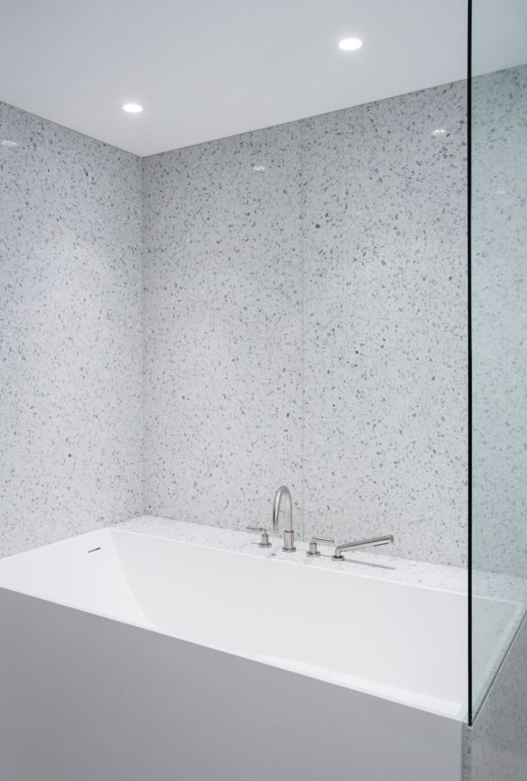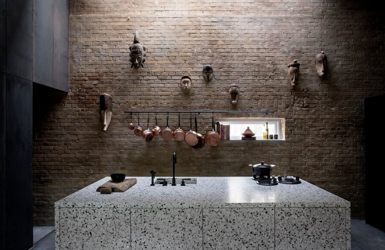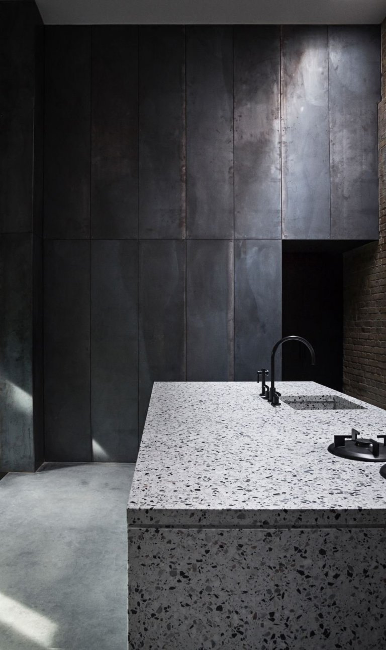 Při vstupu do domu narazíme na předsíň, která slouží jako menší šatna. Jednu ze zdí tvoří zachovaná cihlová stěna, která je zároveň součástí kuchyňského koutu. V kuchyni si můžeme všimnout velkých kontrastů, již vznikají převážně díky kombinaci betonu, žuly, ale i cihel. Jinak bílou koupelnu ozvláštňuje obklad, který najdeme na velkém umyvadle, ale i ve sprše. Díky tomuto jemnému detailu zničíme zdánlivý dojem sterilní místnosti. Obývací pokoj je oázou, která přímo vyzývá k odpočinku. Díky použití světlých barev s výrazně žlutým designovým křeslem působí celá místnost útulně.