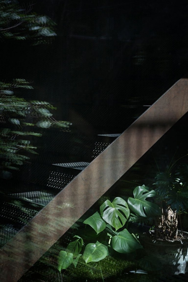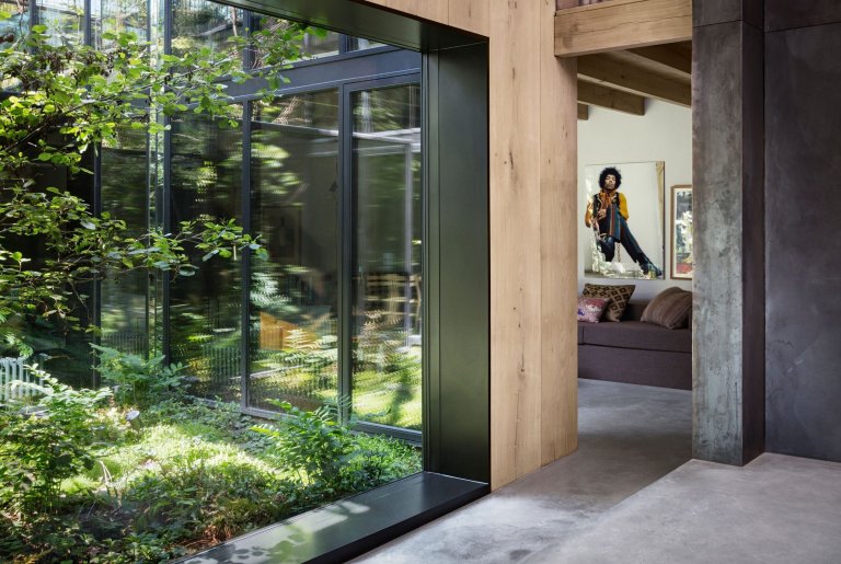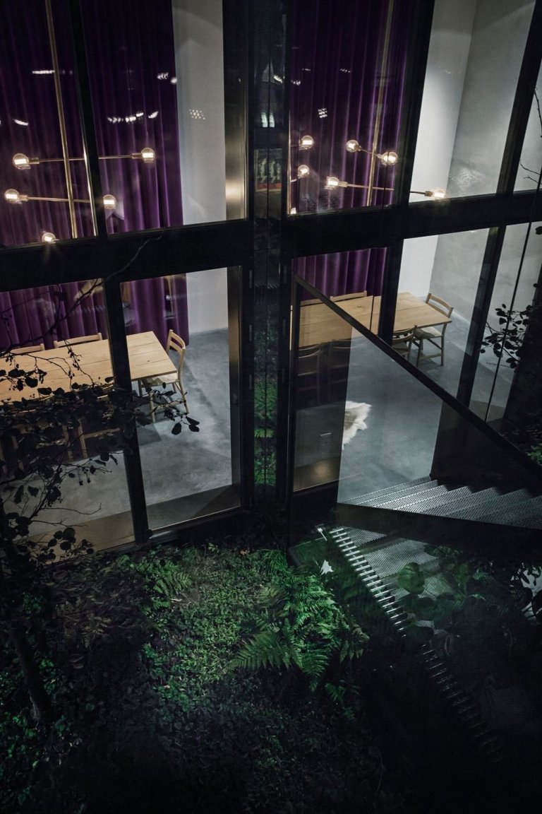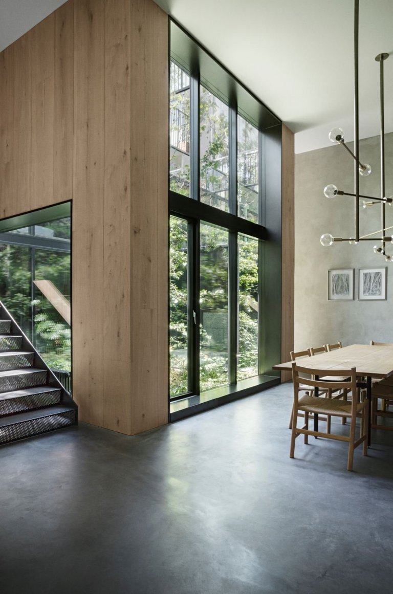 Celý dům tvoří tři podlaží. Přízemí slouží jako společenská část pro setkávání s lidmi, první patro je místem pro ložnice a jako poslední je střecha s krásným výhledem do okolí. Majitel si přál zachovat několik původních prvků domu, mezi nimi například cihlovou stěnu z původní garáže. Vzhledem tomu bylo velmi složité, vnést do domu dostatek denního světla a zároveň do interiéru včlenit i dostatek zeleně připomínající skandinávské lesy. Architekti vše vyřešili tak, že do hlavní části domu zabudovali prosklené atrium, které domu dodá jak světlo, tak i již zmiňovanou zeleň. Vzhledem k tomu, že je atrium v centrální části domu, světlo dopadá do všech místností, které v přízemí najdeme.