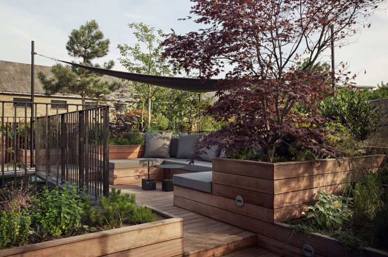Ačkoliv je přízemí velkou ukázkou chladu a kovu, celé první patro (které se nachází jen na části půdorysu z přízemí, což dává prostor k vyšším stropům) hraje teplými odstíny. Převažuje zde dubové dřevo, které lze považovat za primární materiál, jenž byl v prvním patře využit. Poslední částí domu je prostorná střešní zahrada, nabízející příjemné posezení mezi zelení.