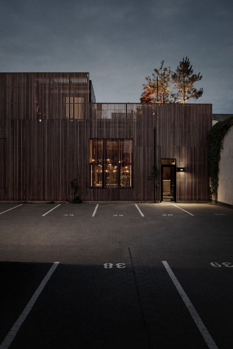 Pokud začneme od exteriéru budovy, musíme si všimnout, že i když jde o poměrně jednoduchou stavbu ve tvaru kvádru, díky obložení z brazilského dřeva, dům působí vzhledem k okolí nenásilně. Díky citlivému výběru materiálů se dalo vzniku vskutku unikátní stavbě, která splňuje všechny požadavky na bydlení, jenž se dá označovat za luxusní.