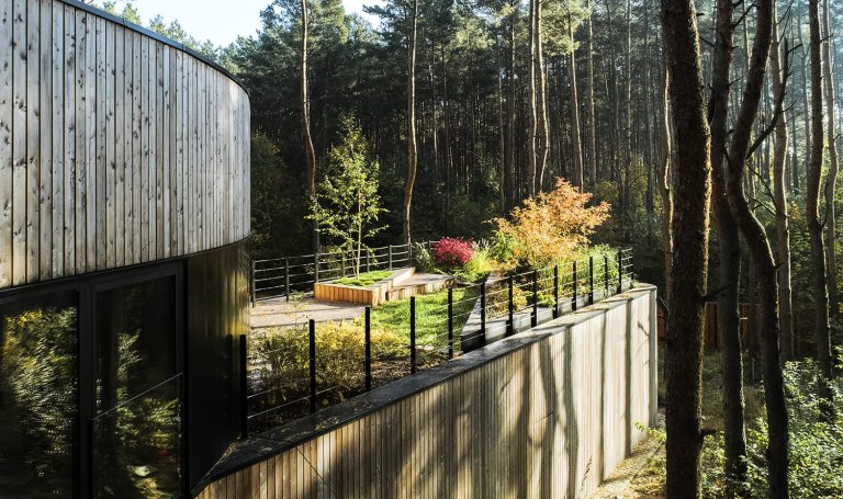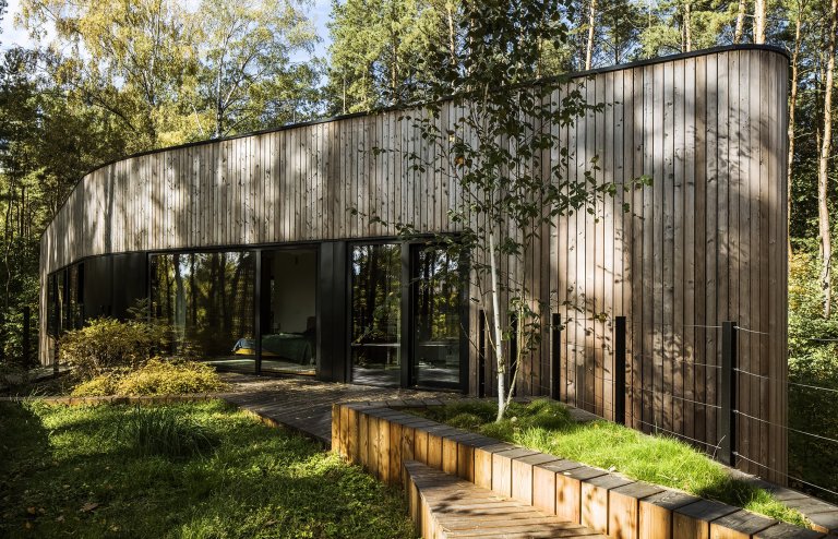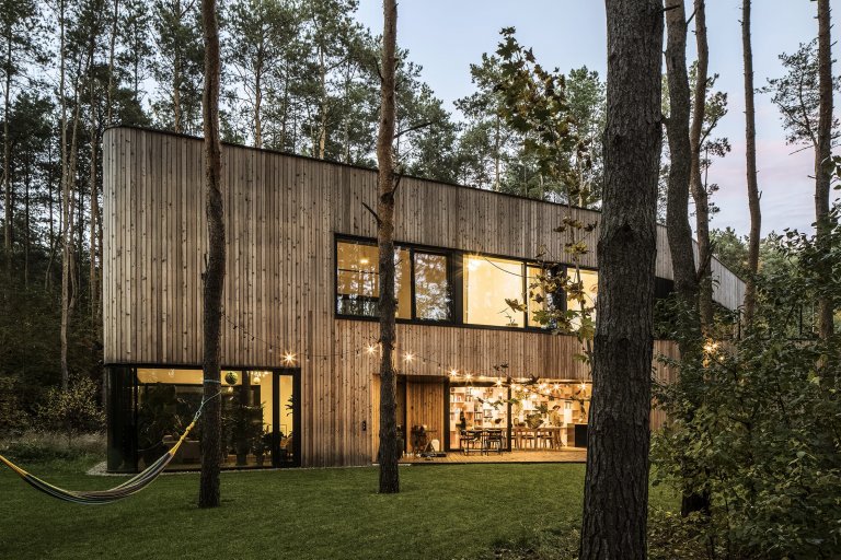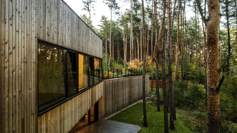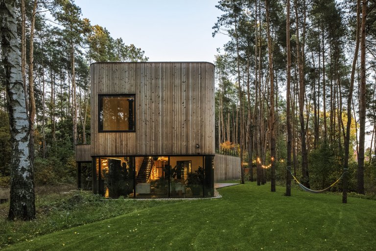 Rodinný dům na okraji Varšavy byl navržen ve formě jednoduchého zaobleného bloku, který zdobí fasáda z neimpregnovaných sibiřských modřínových desek. Stavení je obklopeno borovým lesem a díky přirozenému vzhledu fasády dokonale zapadá do okolí. Celková plocha zaujímá 260 m2, přičemž největší část zabírá otevřené přízemí, které je velkoryse prosklené. Díky panoramatickým oknům, která jsou v přízemí instalována, les vizuálně proniká do interiéru. Ložnice a další pokoje ve druhém patře jsou menší, ale stejně prostorné a otevřené vnějšímu světu.