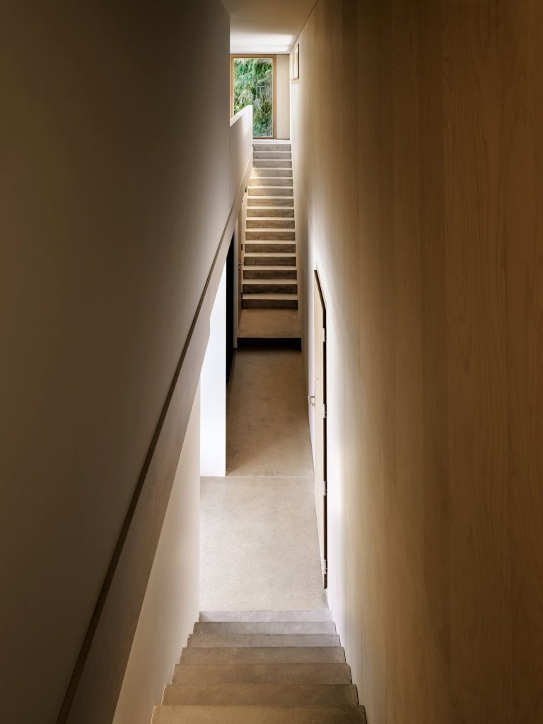 Hlavní devizou domu jsou jeho velkorysé výhledy do přírody. Velkými okny dovnitř proudí dostatek přirozeného světla, které spoludotváří příjemnou atmosféru v interiéru. K té rovněž napomáhá hojnost dřeva, které ve svém světlém odstínu prohřívá jednotlivé místnosti. Interiér je striktně minimalistického rázu, svěží dojem zde obstarávají především neustále se měnící obrazy přírody za velkými prosklenými plochami. Společenskou část domu rozšiřuje dřevěná terasa, v jejímž středu se nachází praktické sezení určené k práci nebo k odpočinku na čerstvém vzduchu.