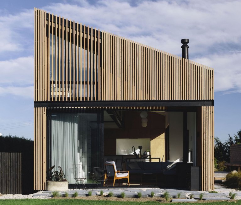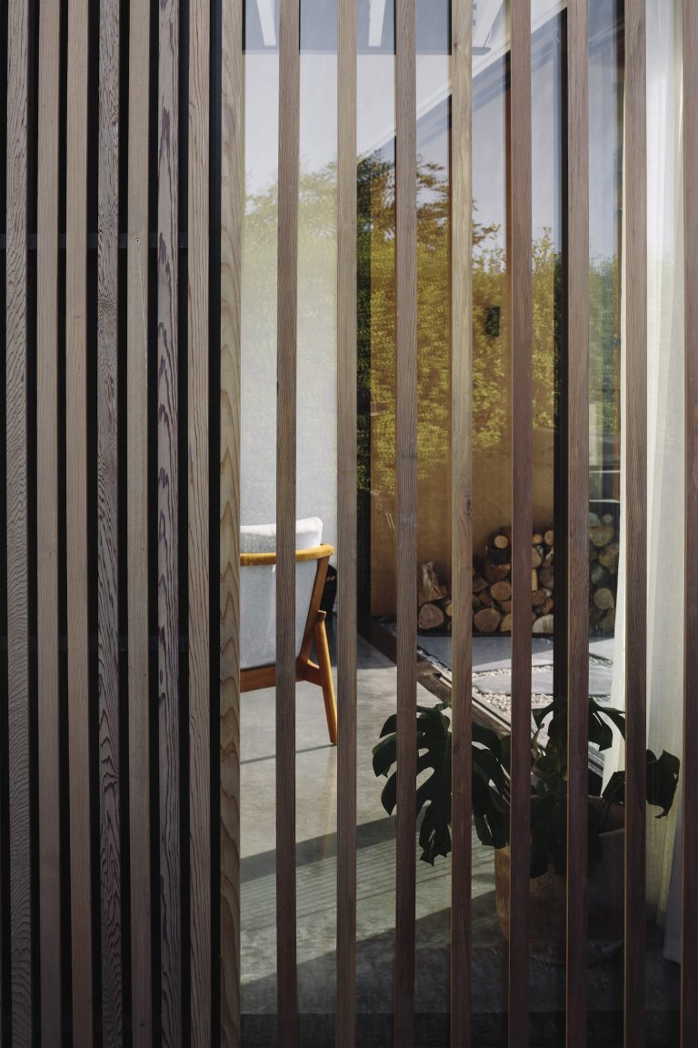 Pozemek je poměrně úzký, na šířku má jen 13 metrů, takže byl nutný projekt s relativně malým stavebním místem. Daniel zpočátku navrhl chalupu o ploše 30 m², ale uvědomil si, že pro rodinu s dítětem potřebuje plnohodnotný dům. Zrodila se tedy myšlenka dvoupodlažního domu, jehož plocha je 124 m². První patro je velké 99 m², druhé má 25 m². Domu vévodí cedrová fasáda s přístřeškem. Pozemek byl tak malý, že se na něj nevešla garáž. Střecha má sklon 20⁰ přes šířku domu a je nakloněna po celé délce. Z tohoto důvodu se ze strany hlavního vchodu zdá dům kompaktnější, než ve skutečnosti je. Vnitřní uspořádání muselo být také důkladně navrženo. Obývací pokoj a mezanin jsou umístěny pod vysokou částí střechy, zatímco nejnižší pokoje jsou vyhrazeny pro ložnice.