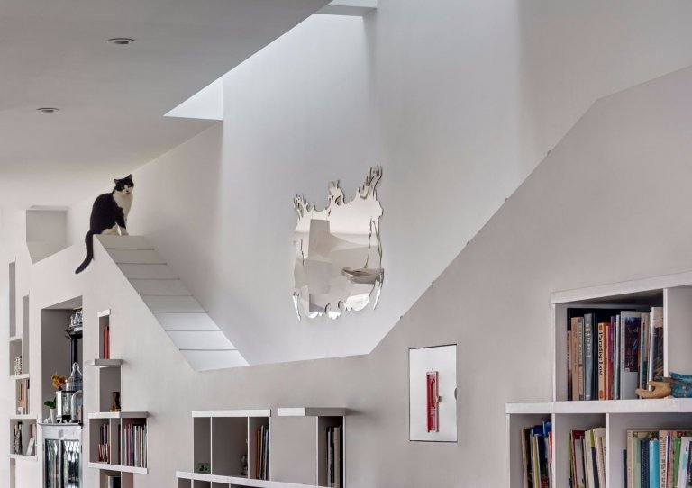 Cílem architektů bylo vytvořit krásné místo pro psaní, sebevzdělávání, nabírání inspirace a zasloužený odpočinek. Velký prostor tak dostaly knihy, obrazy a různé sošky, ani dvě kočičí kamarádky si ale vůbec nemusí stěžovat. Zatímco policový systém táhnoucí se přes celou stěnu obývacího pokoje až do jídelny slouží pro knihy a umělecké předměty, jeho horní část je uzpůsobena pohybu kočičích obyvatel. A jsou tu dokonce i kočičí dvířka a průlezy mezi patry domu. Kočky se tak docela nečekaně mohou zjevit i v ložnici.