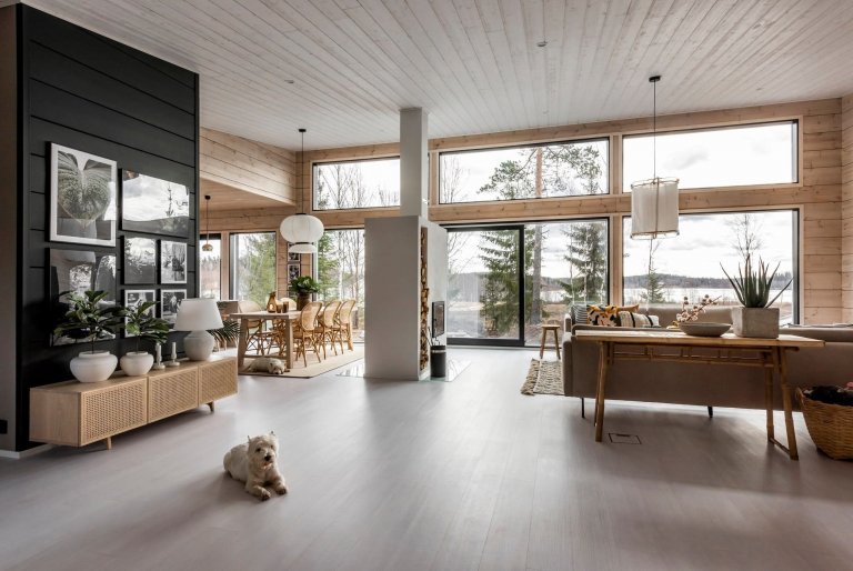 Srdcem chalupy je světnice dostatečně velká pro setkávání členů rodiny i přátel. Pod již zmíněnými tradičně řešenými okny se nachází přirozeně krásný jídelní stůl, který doplňují bíle lakované židle. Rustikální atmosféru v místnosti podtrhují odhalené stropní trámy a zájmu návštěvníků jistě neujdou ani minimalistická svítidla. Minimalismus se obecně odráží ve všech místnostech rodinného domu, a tak může naplno vyniknout půvab hojně využitého dřeva světlých tónů. Samotná fasáda domu je přitom tvořena obložením z vícero druhů dřeva včetně šindele. Štípané dřevěné šindele dostávají prostor i v interiéru, kterému tak dodávají harmonický i velice originální efekt.
