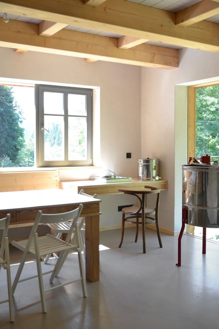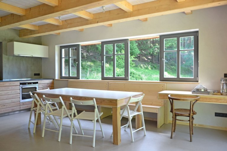 Jedním z prvků odkazujících na tradiční architekturu je způsob zasklení části v kuchyni a jídelně. Zde byla totiž do velkého vodorovného obdélníku nezvykle včleněna tři okna v rámu. Tyto neobyčejně řešené průzory z interiéru do exteriéru najdeme v obměně i v některých dalších místnostech. Nejenže díky nim prostupuje do interiéru dostatečný přísun denního světla, ale jednotlivé místnosti se o to více propojují s překrásnou přírodou za okny. Neskutečný požitek v tomto případě nabízí zejména koupelna, která se díky velkému otevřenému oknu přímo nad vanou automaticky stává příjemnou oázou klidu s vůní blízké přírody.