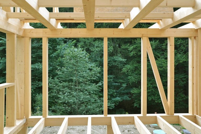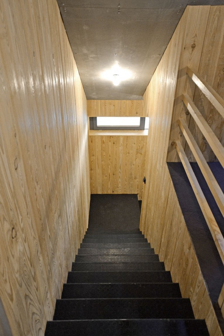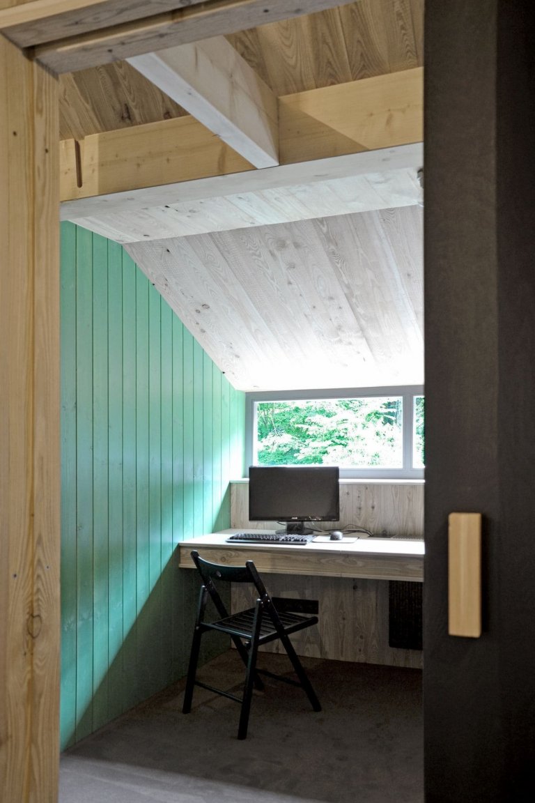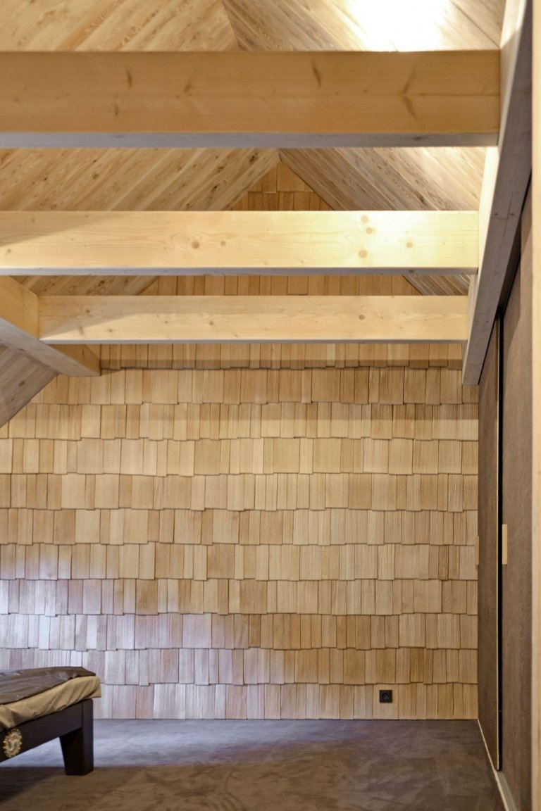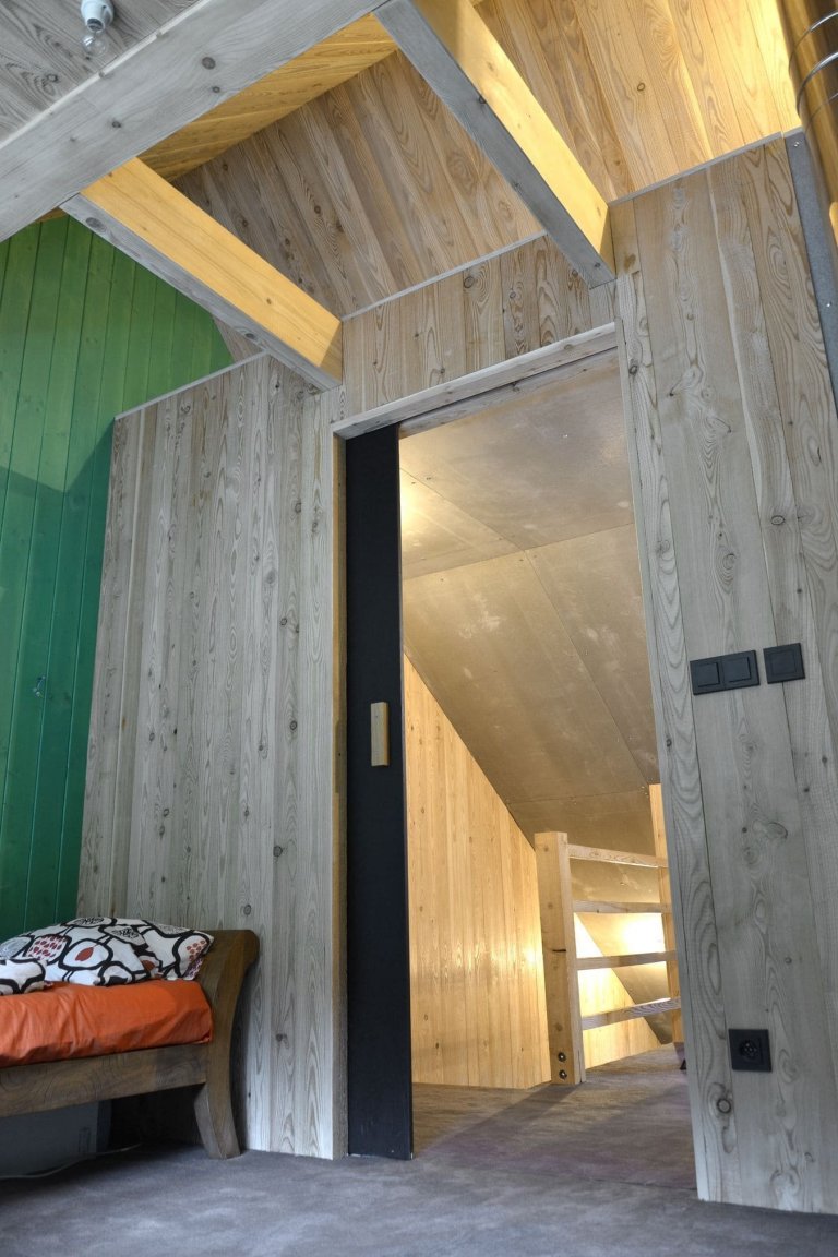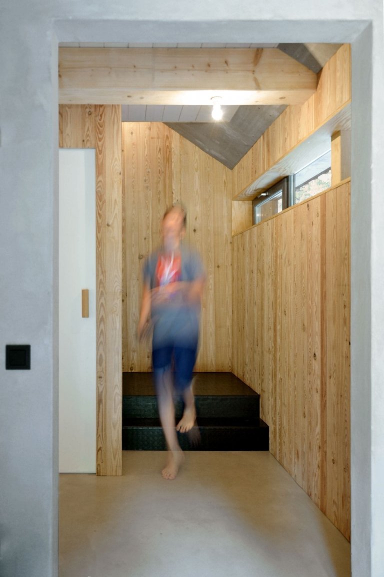 Tento dřevěný rodinný dům je unikátní především tím, že se o jeho realizaci včetně výroby nábytku postaral sám majitel. Jednotlivé myšlenky a nápady tak uzrávaly v jejím průběhu, a tak nebylo pozdě na to sem tam něco změnit. Zatímco se tak majitel při výrobě nábytku a zařízení dispozičně držel návrhů architekta, materiálově a konstrukčně si vše koncipoval podle svých technických možností.