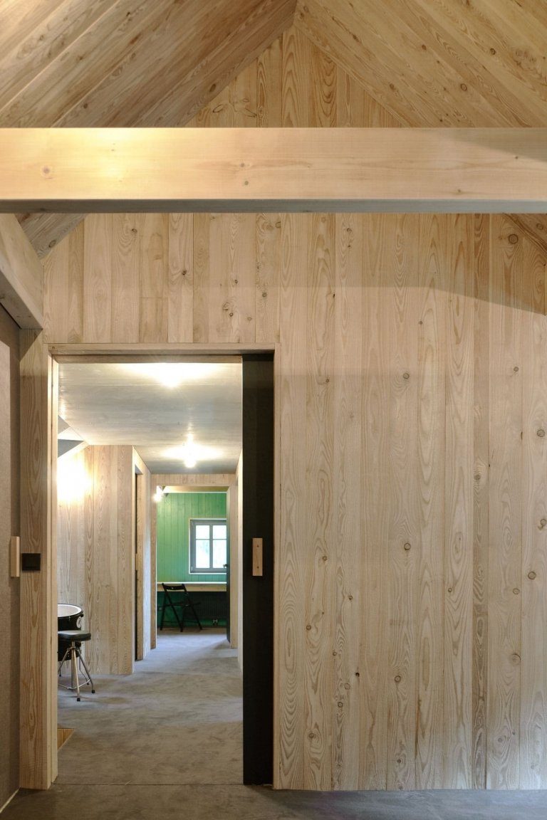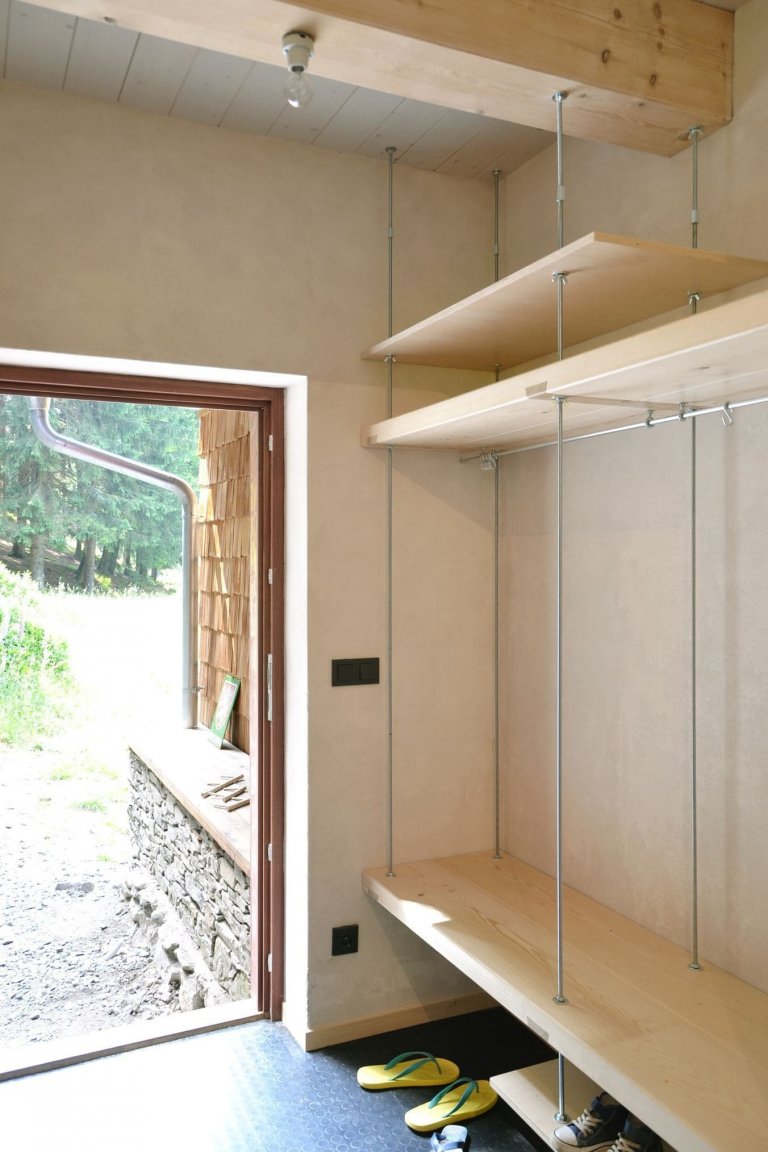 Krása i praktičnost zvolených materiálů se odráží v interiéru i exteriéru. Precizně zpracovaná dřevěná rámová konstrukce, izolovaná prodyšnými dřevovláknitými materiály, je osazena na soklu z pohledového betonu. Sendvičové obvodové konstrukce jsou přitom řešeny zcela bez použití fólií a OSB desek. Ty jsou nahrazeny pouze papírovými fóliemi. Velké rozpony stropních trámů vycházejí z původního řešení stavby. Spolu s použitím dřevovláknitých izolací se ve výsledku jedná o čistou dřevěnou konstrukci s parametry nízkoenergetického domu, ve kterém je velmi příjemné klima. Při stavbě domu totiž byly v maximální míře využity místní, přírodní či recyklované materiály, které tak snižují vliv stavby na životní prostředí. Jelikož se jedná o chalupu, kterou si svépomocí postavil majitel, který pracuje jako tesař, dřevo v ní hraje velkou roli. Je to patrné například u přiznaného trámového stropu či obkladů z hrubých, pouze okartáčovaných modřínových prken.