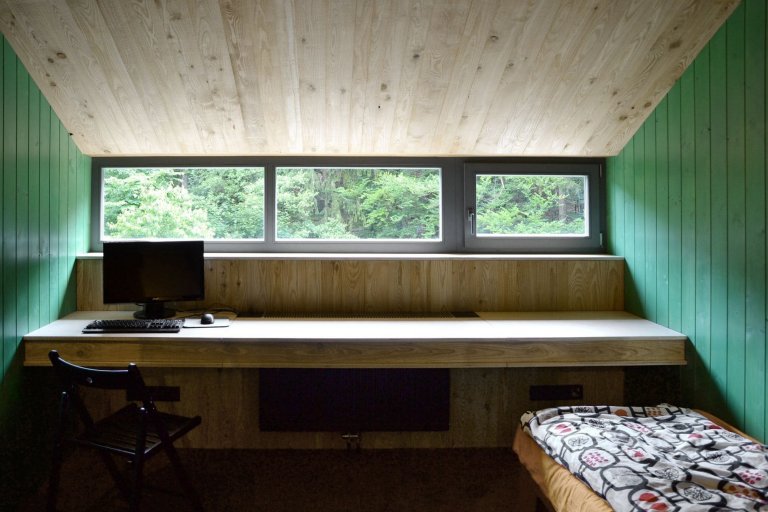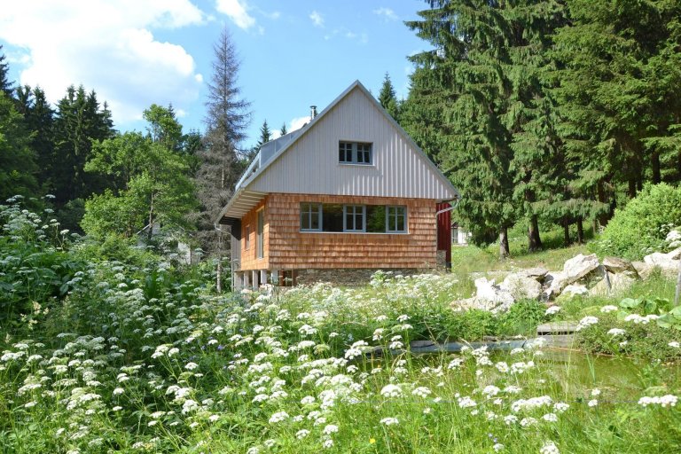 Ve Staré Huti se podél pravého přítoku řeky Bělé táhne řada chalup, které jsou jedna od druhé odděleny bujnou zelení a vzrostlými stromy Orlických hor. Mezi chalupami v dávno zaniklé sklářské huti najdeme i tu, za jejímž projektem stojí Lukáš Svoboda ze studia Architekti.in. Nachází se na louce u lesní cesty a vypadá, jakoby tu stála odjakživa.
