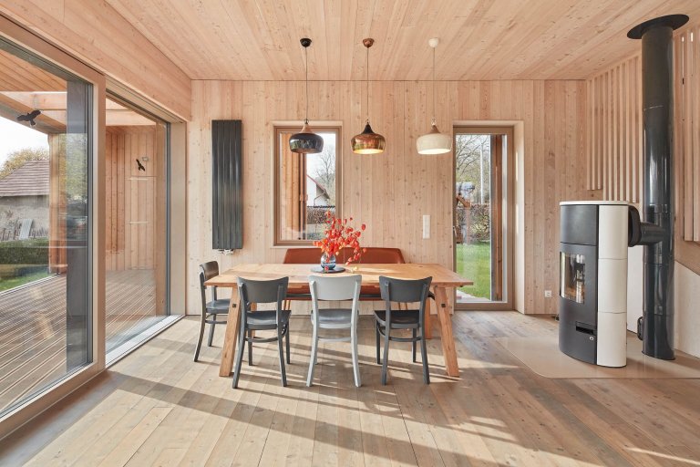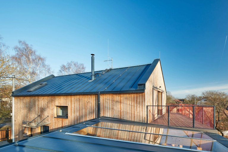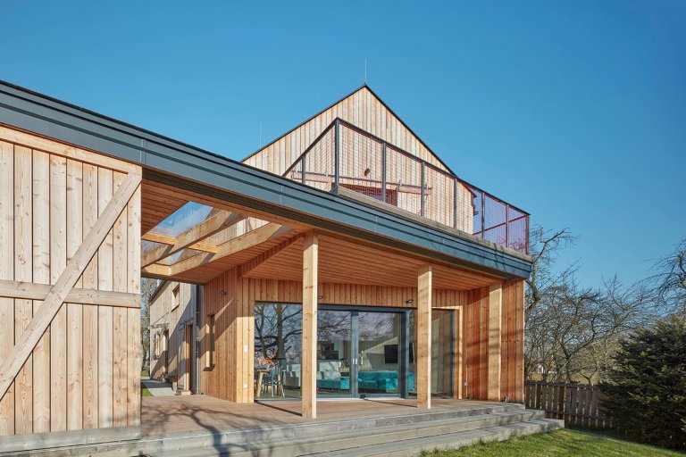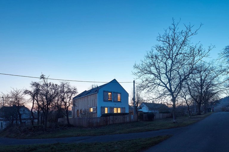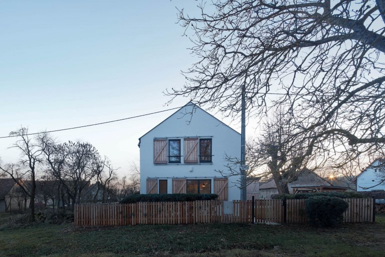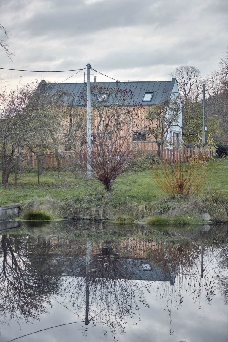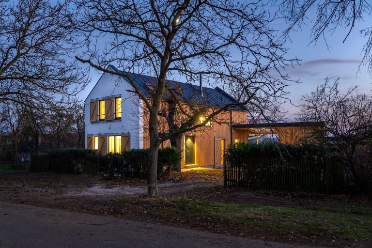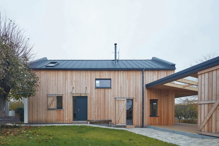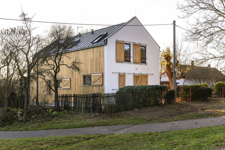 Do jedné z vesniček na Příbramsku byl po vzoru původního stavení zasazen moderní dřevěný dům pro čtyřčlennou rodinu. Jeho omítnutý štít vyhlížející k návsi ani samotné obrysy při pohledu z dálky nenaznačují, že byl starý dům nahrazen novým. Vychází z původních vesnických staveb, svým majitelům však nabízí mnohem větší komfort.