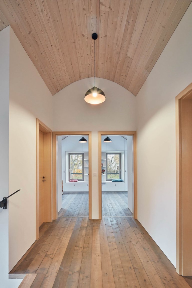 Architektky řešily nové bydlení tak, aby mělo dostatek světla uvnitř domu i v zahradě. Jižní křídlo proto sestává z terasy s kůlnou otevřenou na sever i na jih. Poskytuje nápadité průhledy, a přitom ji lze v případě potřeby uzavřít. Také do obývacího pokoje bylo zapotřebí přivést více světla, a tak jej nově zdobí praktický a estetický světlík. Terasa navazující na ložnici rodičů v patře poskytuje krásné výhledy do přírody, navíc se zde majitelé mohou zchladit po návštěvě sauny.