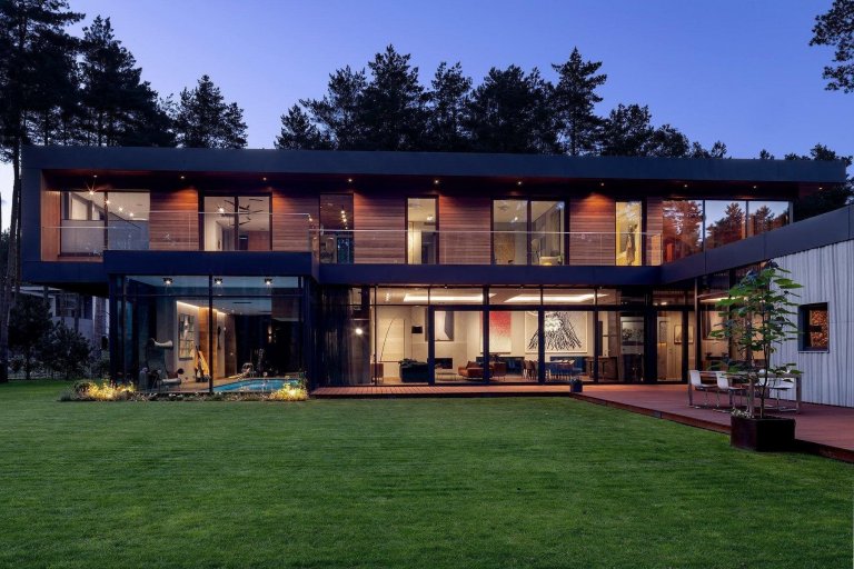 Architekti projektu rodinného domu v Mazovii sáhli po moderních materiálech jakým je sklo, ocel a především beton. Tento syrový, výrazný stavební materiál se stále častěji objevuje v architektuře rodinných domů, protože ho lze využít mnoha zajímavými způsoby, které tvoří moderní prostor. Navíc lze jednoduše kombinovat s přírodními materiály. Dům vyniká právě netradiční betonovou fasádou. Zatímco ze zahrady byl dům vybaven zcela prosklenými stěnami, ostatní stěny byly odlité z betonu, což mu dává neobvyklý charakter, protože beton byl tvarován do podoby ve větru se vlnících záclon. Tato původní myšlenka odlehčila těžký surový beton a změnila ho v dekorativní prvek. Spolu s prosklenou stěnou a beton byl k fasádě použit i dřevěný akcent, který ladí s okolními stromy.