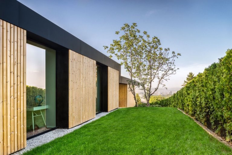 Dům s prosklenými stěnami orientovanými do svažité zahrady
