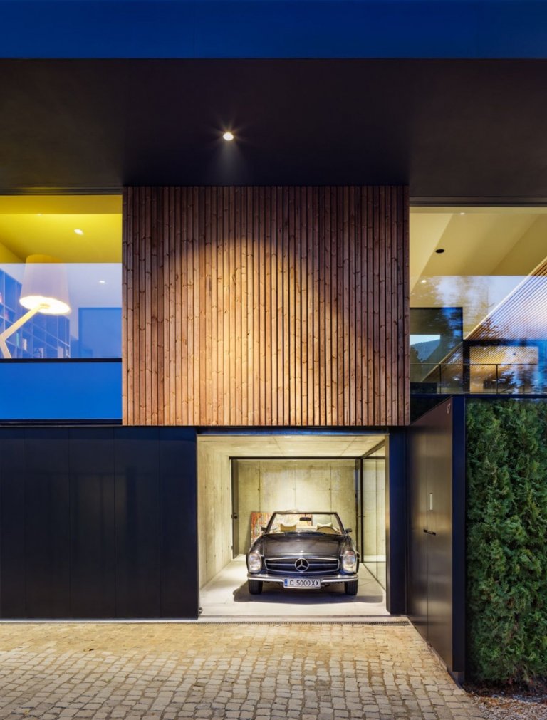 Luxusní mercedes je jednou z ozdob rezidence. Prosklená stěna vložená mezi schodiště a vestavěnou garáž činí z klasického vozu majitele dekorativní kus, když se právě nepoužívá. Obyvatelům domu a jejich hostům se tak nabízí další velkolepá podívaná. Dům ve svahu na okraji Sofie se přitom nachází mezi městem a horami, a tak poskytuje panoramatický výhled ve dvou směrech - dolů do ulic města a nahoru přes zahradu na vrcholky hor. Střecha mírně vyčnívá do prostoru, aby svým majitelům poskytla chráněné přístřeší. Mohou odtud pozorovat dění v zahradě i překrásnou krajinu v dáli.