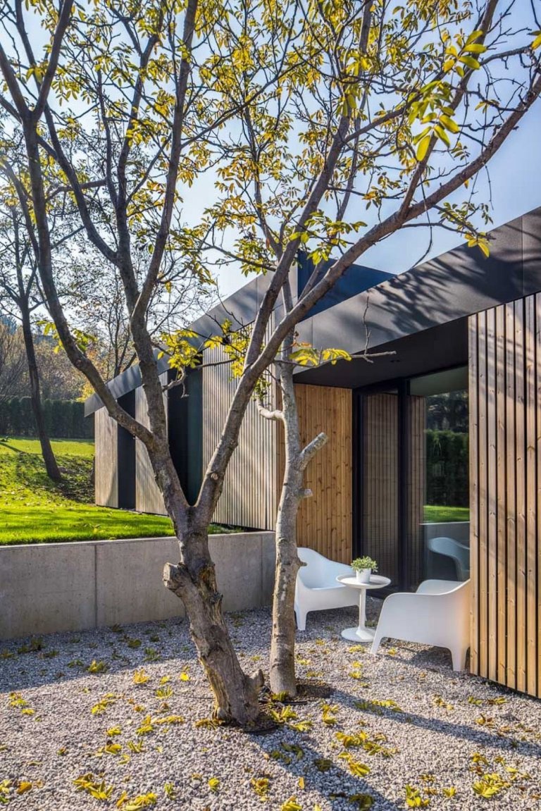 Velké prosklené plochy orientované do svažité zahrady z druhé strany doplňují zapuštěná okna, která byla zasazena do dřevěného obkladu. Pod nimi se táhne svěží živý plot vytvářející přirozeně krásnou bariéru mezi uliční a soukromou částí. Tato zástěna sleduje sklon ulice a svou zelenou barvou příjemně doplňuje dřevěnou fasádu domu. Zahradu krášlí stromy v čele se vzrostlým ořešákem. Výhledy na ni pak poskytují četná prosklená zákoutí domu. Vzniká tak působivé propojení interiéru s exteriérem.