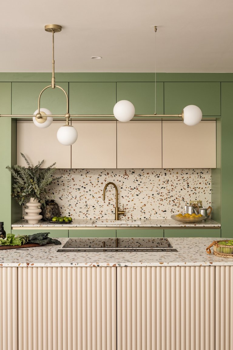 Překrásnou souhru zahrady a interiéru umocňuje půvabná kuchyňská linka osvěžená příjemným odstínem zelené barvy. Kuchyňská linka s ostrůvkem byla také navržena Studiem Jayga Architects, a to tak, aby příhodně doplnila měkké křivky klenutých dveří a výklopného okna. Kuchyňský ostrůvek přitom zdobí barevná teracová pracovní deska. V kuchyni nechybí ani dostatek úložného prostoru. Bílá barva, pastelová zelená, dřevo a dlaždice – to je příjemná kombinace pro naprosto svěží dojem z této nové kuchyně, která je na přání majitelů úzce propojená se zahradou.