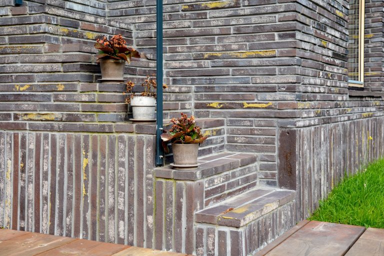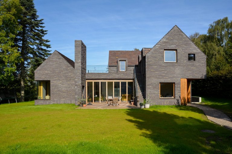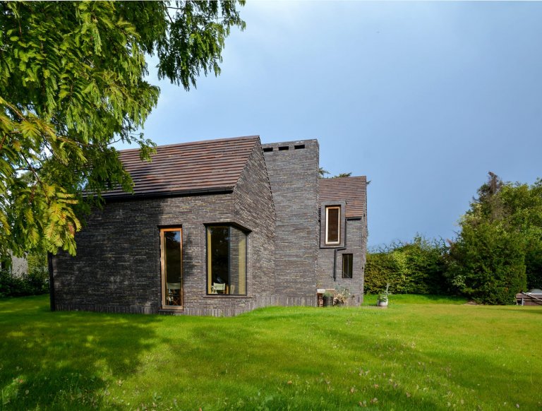 Dům zaujme kolemjdoucí na první pohled. Jednoduchost skandinávského stylu doprovází dotek anglické architektury, na kterou odkazují zejména fasády z tmavých šedohnědých cihel. Ty svou strukturou zjemňují poněkud chladný dojem skandinávského stylu. Stejný materiál pokrývá i sedlové střechy, které tak vytváří monolitický efekt stavby. Jedná se sice o jeden dům, ale střechy má hned tři. Zajímavě vypadá také masivní komín. Celek jako by působil pozoruhodným abstraktním dojmem, vypadá jakoby neukončeně Vchod do domu je ozvláštněn dřevěným obložením. Dřevo se s šedohnědými cihlami setkává i na několika dalších místech, čímž dochází k příjemnému vizuálnímu osvěžení.