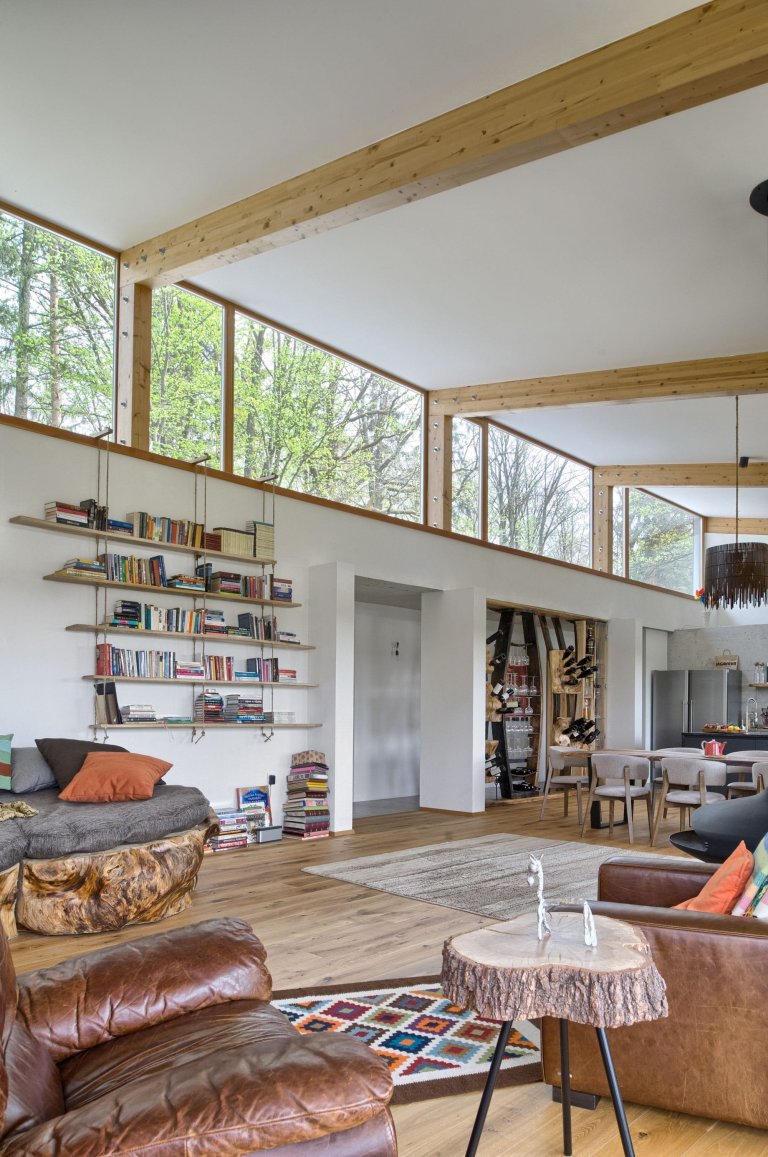 Celý interiér je laděn do tlumených přírodních barev – šedé, béžové, bílé a hnědé, která je zde na dřevěných prvcích – například rámy u oken. Za povšimnutí stojí moderní regály nad kuchyňskou linkou, malířský stojan s obrazem přímo v koupelně, ale také stolek, který je z pařezu.