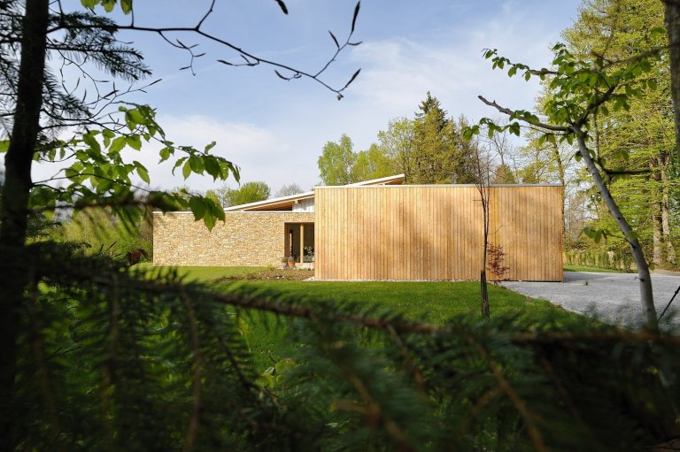 Ze strany od ulice můžeme vidět pouze dům s garážovými vraty, dveře a minimum oken, což zajišťuje dokonalé soukromí. Na druhou stranu zde nechybí ani dostatek světla, protože strana, jež je vedena do zahrady, je téměř celá prosklená a navazuje na krytou terasu. Fasáda domu je ze strany do ulice i do zahrady řešena kamenným obložením, který svojí barvou krásně zapadá do prostředí. Zbývající části fasády tvoří dřevěné obložení.