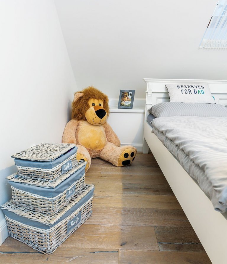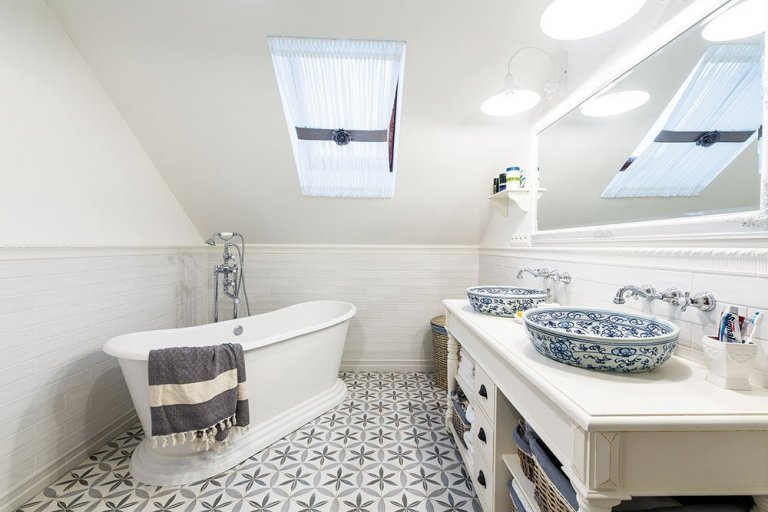 Nejkrásnější perlou celého domu je prostorná a světlá koupelna v patře. Pocit luxusu jí dodává volně stojící vana a dvě malovaná umyvadla. Velice efektní jsou také „starodávné“ kohoutky a armatury. Romanticky působí i speciálně navržené záclony na střešní okna. Ke ztišení, relaxaci a třeba i načerpání nových vědomostí slouží malý koutek vybavený houpacím křeslem, lampou a knihou v dalším z pokojů. Také známé pravidlo hygge zde tedy má své místo.
