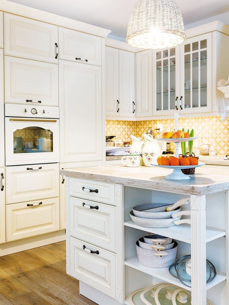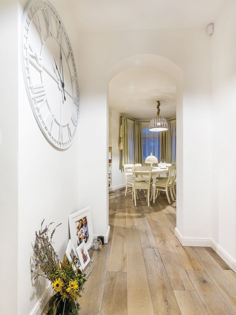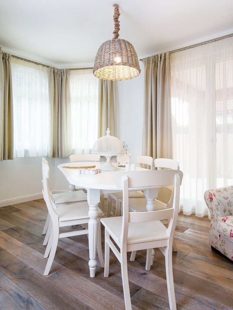 Anglický venkov tu dýchá z každé místnosti. Ve všech převažují světlé tóny barev, a proto působí tak útulným a hřejivým dojmem. Krásný pohled je tak především na bělostně něžnou kuchyni, která je mimořádně prostorná a jejímž centrem je ostrůvek, okolo kterého se odehrává rodinný život v domě. Prosvětlená jídelna s masivním stolem zase doslova vybízí k tomu, abyste se zde usadili a vychutnali si velkorysé stolování tak, jak se patří. Romantickou atmosféru v jídelně podtrhují záclony a závěsy spadající až na zem, které jsou v celém domě šité na míru, aby příjemně ladily s ostatním zařízením.