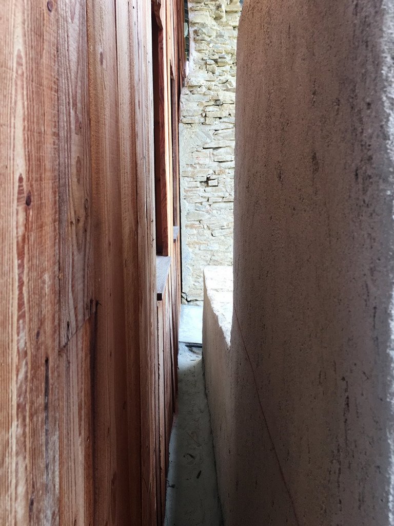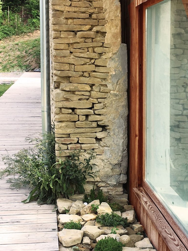 Zbylé kamenné zdi původní usedlosti se dál vítězoslavně tyčily do okolí, a daly tak architektům impuls, jak zachovat zdejšího genia loci. Rozhodli se tyto stěny zachovat a vložit do nich jako do schrány minulosti zbrusu nové bydlení. Vznikl tak působivý dům v domě, který poskytuje veškerý komfort odpovídající moderním časům, a přesto si uchovává významnou vzpomínku na časy dávno minulé. Kamenné zdi se tedy staly součástí nového domu. Těsně jej obepínají v místech, kde zůstaly zachovány, a navíc jsou bezpečně skryty pod střešním převisem. Mohou tedy mnohem lépe odolávat rozmarům počasí.