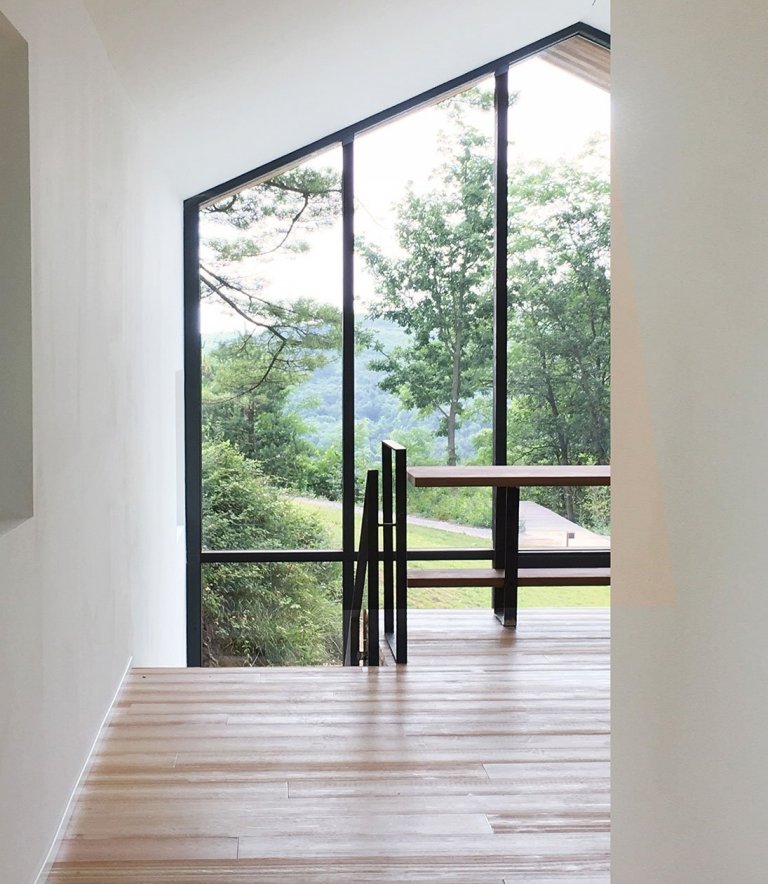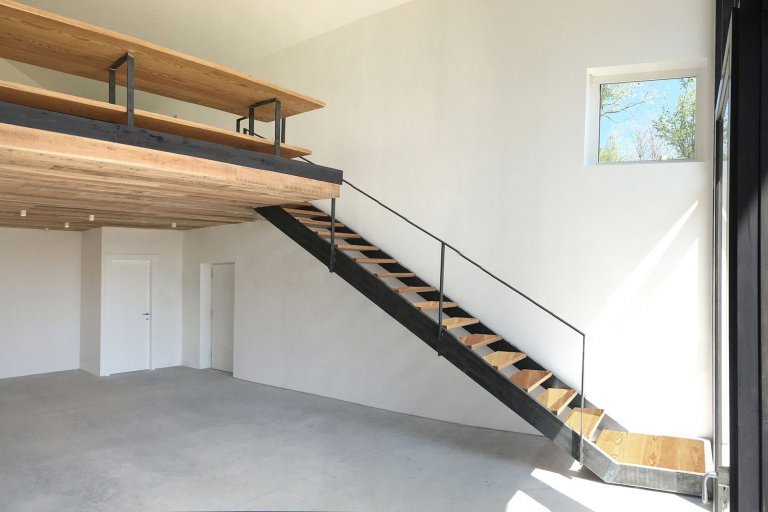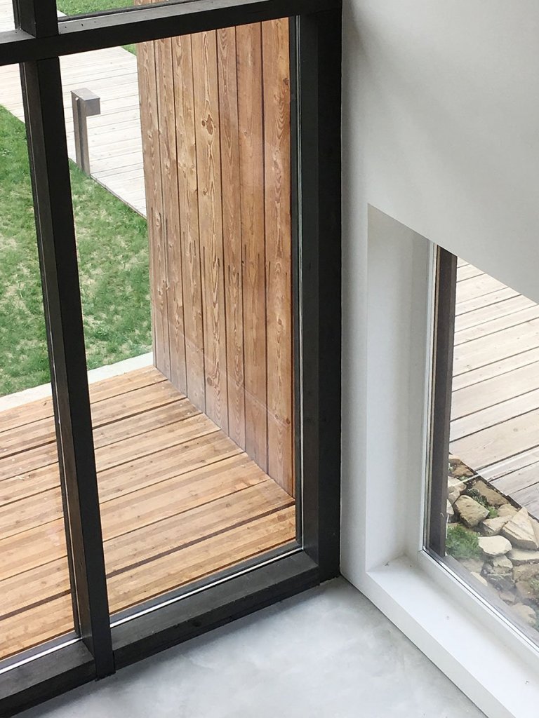 Významným prvkem tohoto bydlení je hra s prostorem. Naznačuje to už zmíněný dřevěný chodníček, který odděluje dům od přilehlého parku. Na jedné straně vede jakoby do nekonečna. Pohyb v interiéru zase umožňuje schodiště z kovu a ze dřeva. Vede do horního patra, v němž se nachází prostorná pracovna. Stůl, který je v ní umístěn, funguje zároveň jako parapet. Pomocí prosklených ploch jsou od zbytku domu odděleny technické místnosti a také ložnice, které jsou považovány za samostatné jednotky.