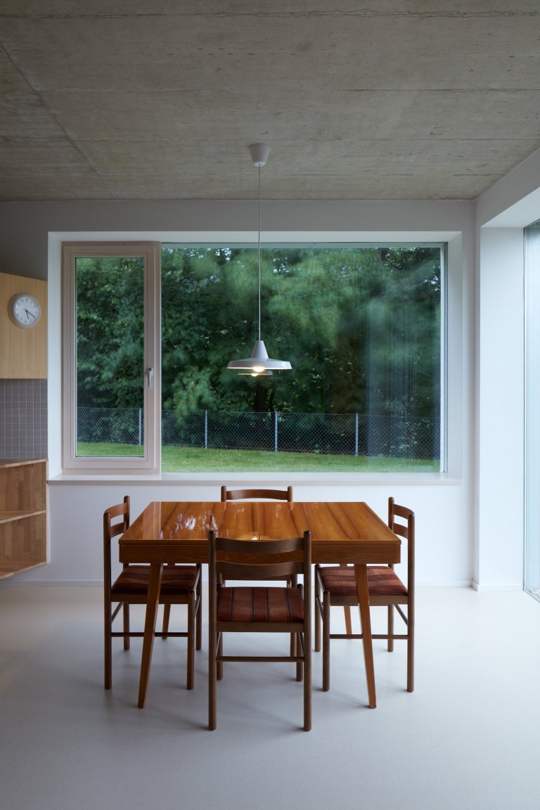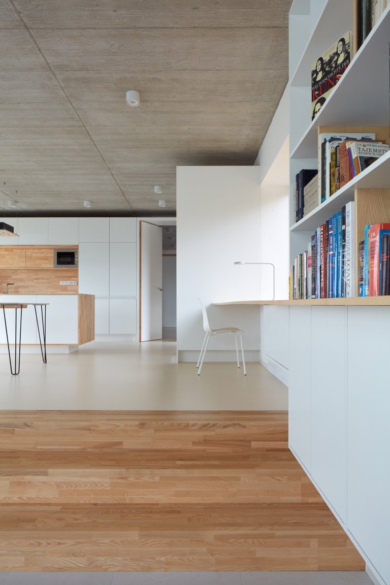 Z fasády do interiéru prostupují světlé odstíny barev a použitého dřeva. Převažuje zde příjemná symbióza bílé barvy a dřevěných prvků. Vzniká tak pohledově čistý, hřejivý a vzdušný interiér. V bytě rodičů je řada nábytku vyrobená přímo na míru. Vestavěný nábytek zde pomáhá šetřit místo, a tak může naplno vyniknout minimalistický styl prostupující napříč jednotlivými místnostmi domu. Poněkud osobitější kusy vybavení už zdobí byt prarodičů, kteří přece jen tíhnou k nostalgickému rázu bydlení.