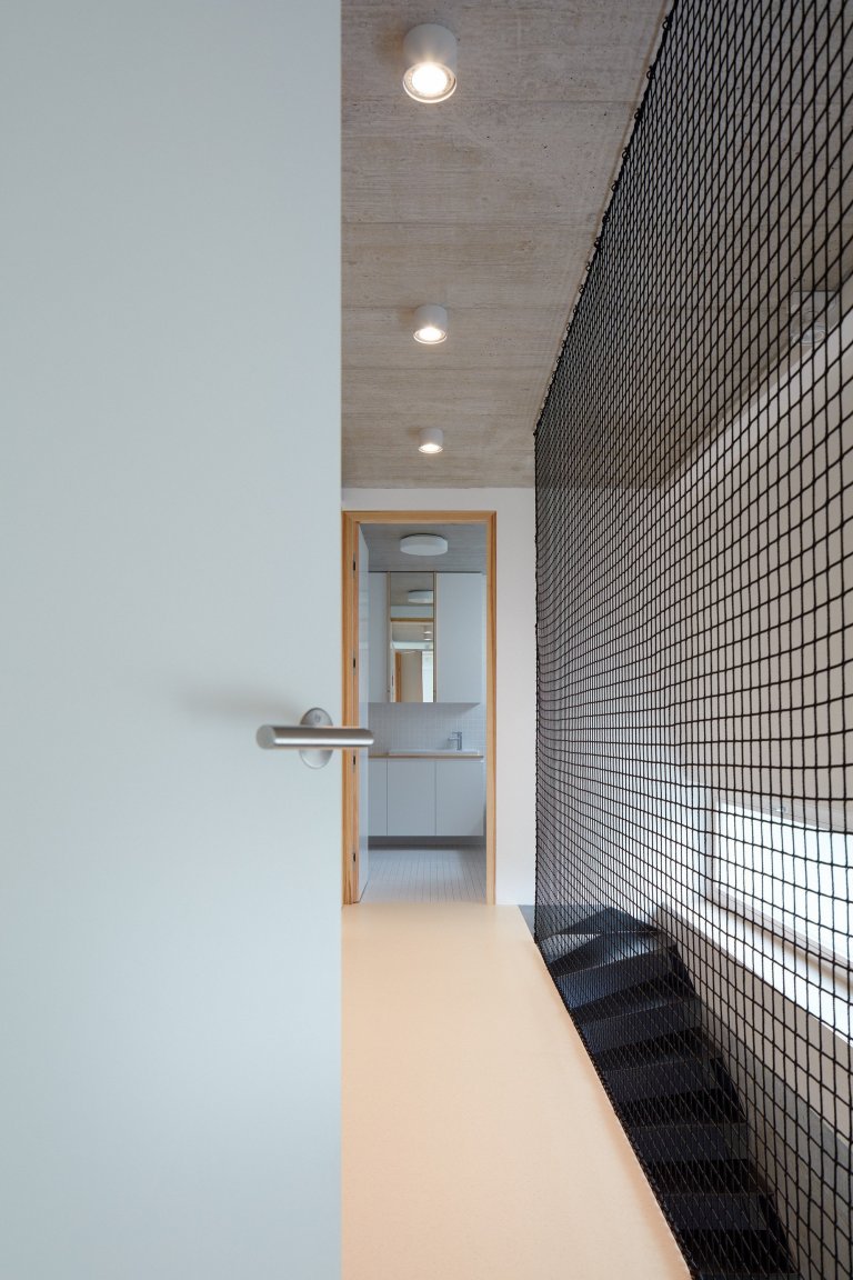 Tento přirozeně krásný a hmotově jednoduchý dům se stal místem určeným pro soužití hned tří generací. Každá zde má přitom dostatek soukromí. V horním podlaží domu se tak nachází větší byt s terasou pro rodiče, ve kterém je situován velký obývací prostor s kuchyní a jídelnou včetně velké ložnice a koupelny. Toto podlaží je vstupní a navazuje na garáž pro dvě auta. Bydlení prarodičů vzniklo v menším bytě ve spodním podlaží, které je přístupné po venkovním betonovém schodišti. Z bytu se dá také vejít přímo na terasu. Obytný prostor prarodičů sestává z ložnice, koupelny a menšího kuchyňského a jídelního koutu. Mezi oba byty byly na úrovni spodního podlaží situovány pokoje pro děti, do kterých se dá vystoupat po vnitřním ocelovém schodišti.