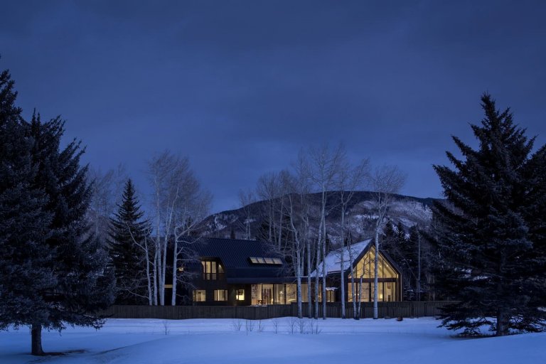 Rodinný dům V-Plan byl postaven v roce 2017 v horském městě Aspen v Coloradu v USA architektonickým studiem Studio B Architects. Majitelé domu, osmdesátiletý manželský pár, rádi tráví čas v přírodě, takže jedním z hlavních přání byla vyvážená kombinace malebných pohledů z oken a pocit soukromí. Také jsou vášniví čtenáři, spisovatelé, cestovatelé a sběratelé umění. To vše bylo zohledněno pro návrhu domu, který musel pojmout sbírku uměleckých děl a také být dostatečně velký, pro návštěvy přátel a příbuzných. Neobvyklý lichoběžníkový tvar místa ovlivnil architekturu budovy a její uspořádání.