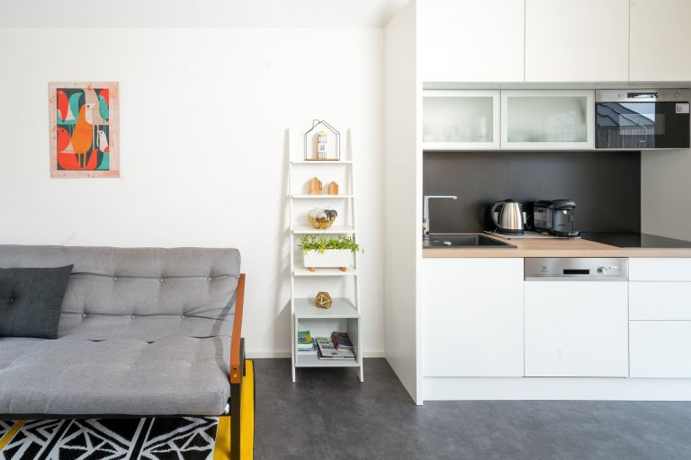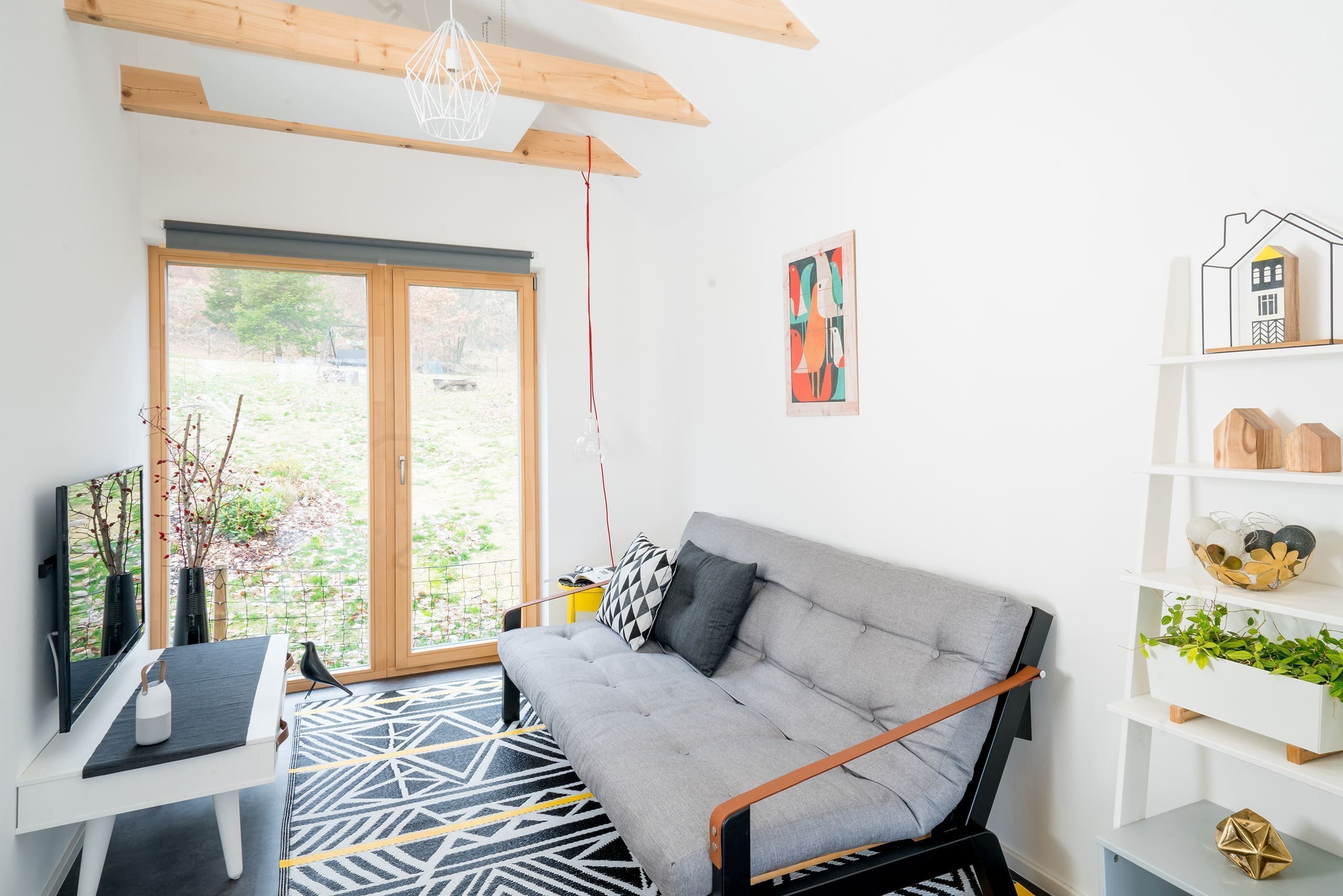 Apartmán splňuje požadavky na komfortní bydlení, přesto je v něm jen to nejdůležitější. Nepotrpí si na přebytek vybavení a doplňků, a tak nabízí úžasně prostorný, světlý a vzdušný prostor k trávení chvil v krásném prostředí úzce propojeném s přírodou. O to se starají rovněž vestavěné skříně, které interiéru zbytečně neubírají na čistotě stylu. Apartmán o ploše 40 m2 tak nabízí příjemné trávení volných chvil pro páry i rodiny s dětmi, které si chtějí odpočinout od starostí všedních dnů uprostřed krásné přírody.