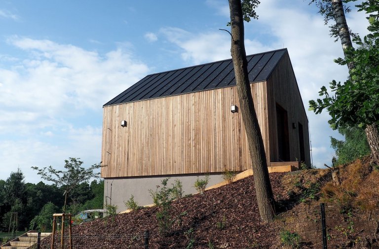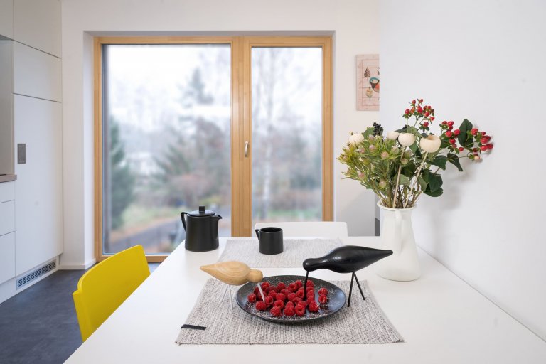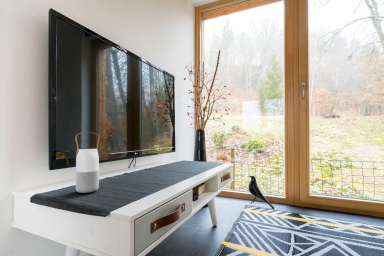 Proměnlivý obraz přírody se dovnitř dostává především prostřednictvím velkého francouzského okna v obývacím pokoji. To svádí k pozorování okolí v průběhu střídajících se ročních období a konkuruje tak do značné míry televizi umístěné nad zajímavě řešeným stolkem s kapkou nostalgie po starých časech. Dotek přírody symbolizují i obnažené dřevěné trámy, opakující se sošky ptáčků, dřevěné doplňky, přírodní textilie a nezbytné pokojové květiny.