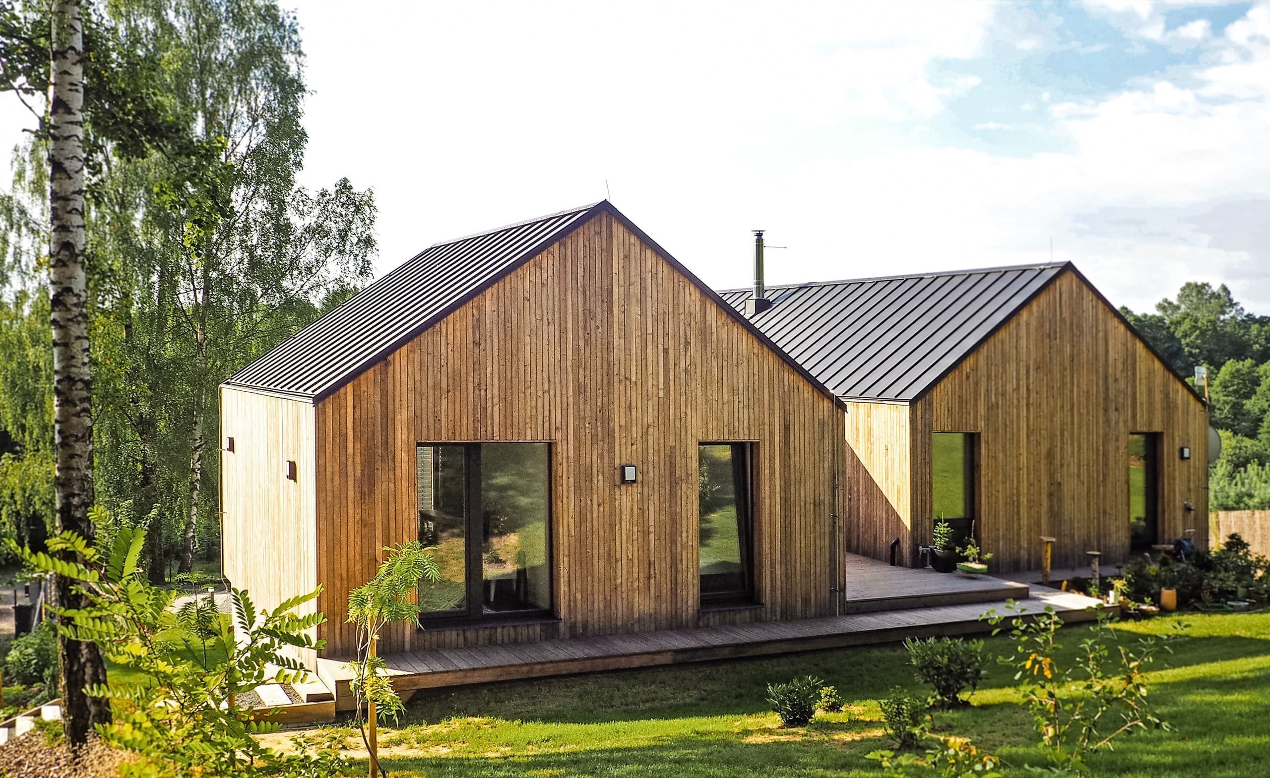 Dva domky jsou ladně zasazeny do krajiny, kterou obklopují vysoké lesy. Bydlení tak získává tolik důležitý pocit soukromí, aniž by mu to ubíralo na světelném komfortu. Dřevěná fasáda domů odkazuje na lásku k přírodě a jejím darům. Velká okna poskytují dechberoucí výhledy do krajiny a hranice mezi interiérem a exteriérem se tak příjemně stírá. Přírodní materiály dostávají prostor také uvnitř apartmánu, kterému vévodí bílá barva. Prohřívají ji světlé tóny dřeva včetně žlutých, oranžových a růžových akcentů. V interiéru převažuje romantický styl v minimalistickém duchu. Nachází se tu řada zajímavých dekorací odkazujících na lásku k přírodě, které dodávají celému bydlení na svěžesti a originalitě.