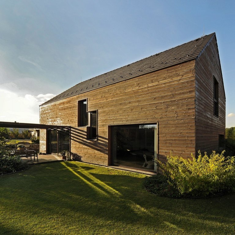 Oba domy vytvářejí příjemný soulad, ačkoliv jsou materiálově řešeny odlišně. Cihly, dřevo, pálené tašky i břidlice umí stárnout s grácií, a tak soužití dvou domů získá časem ještě více na kráse. Příjemná symbióza je přitom už nyní podpořena jejich vnější tvarovou podobností a také společnou zahradou, která se obešla bez plotu. Vzniklo tak důmyslné bydlení bez bariér, které poskytuje dostatek soukromí i kontakt mezi dvěma rodinami.