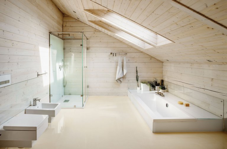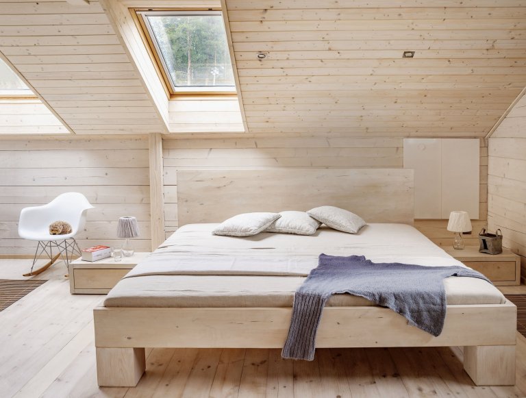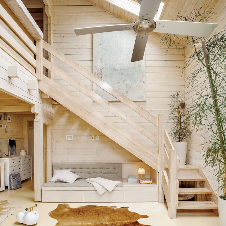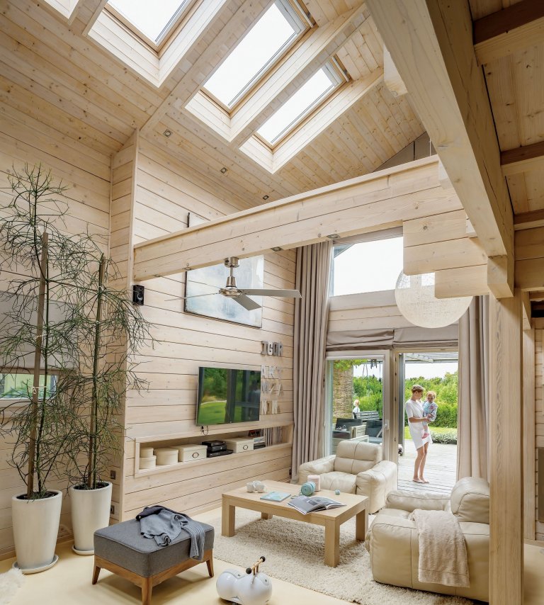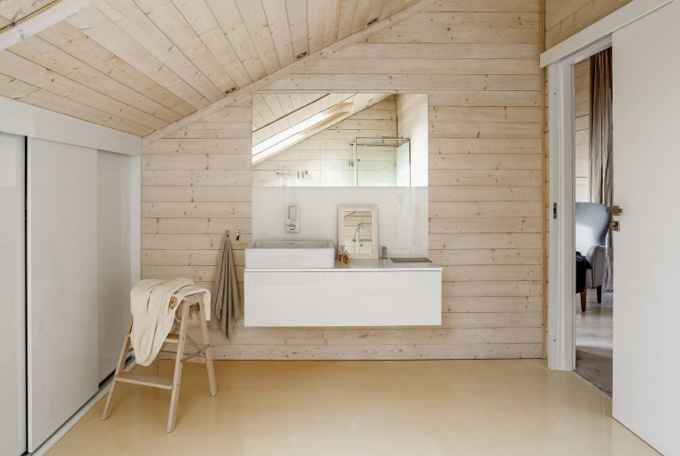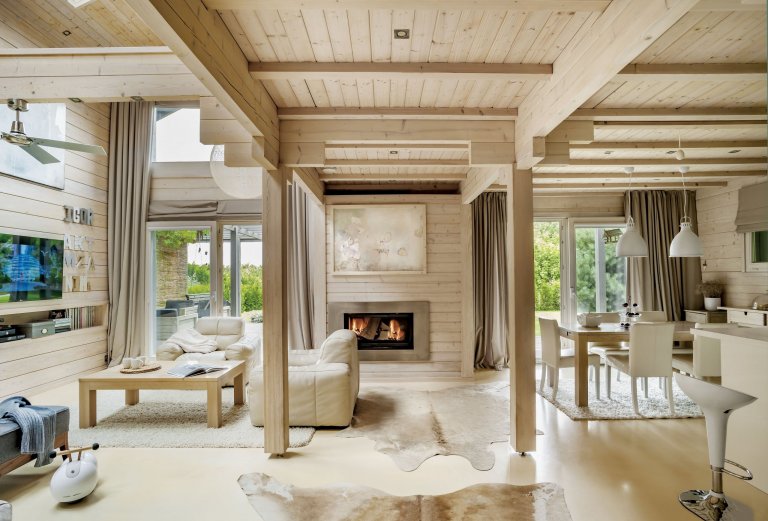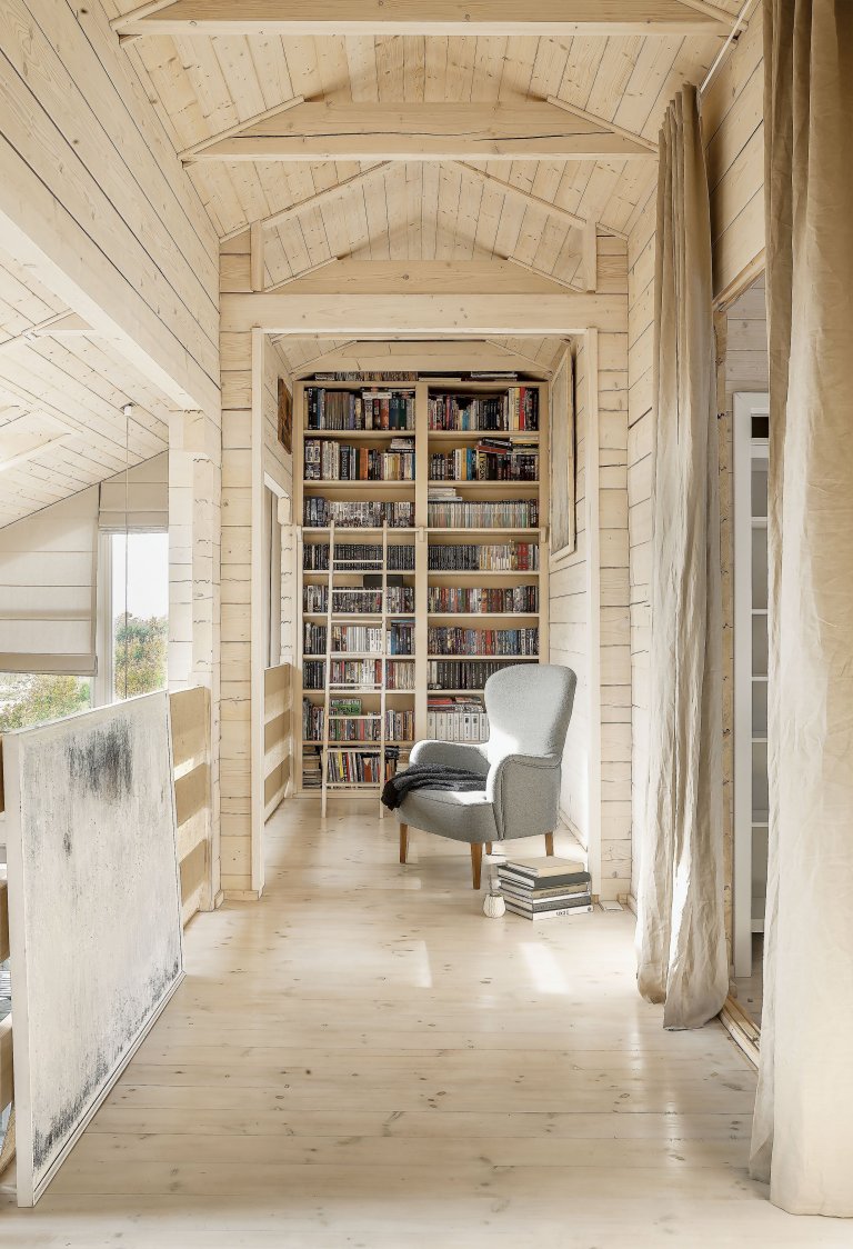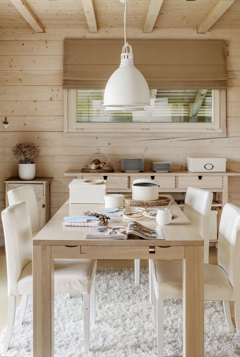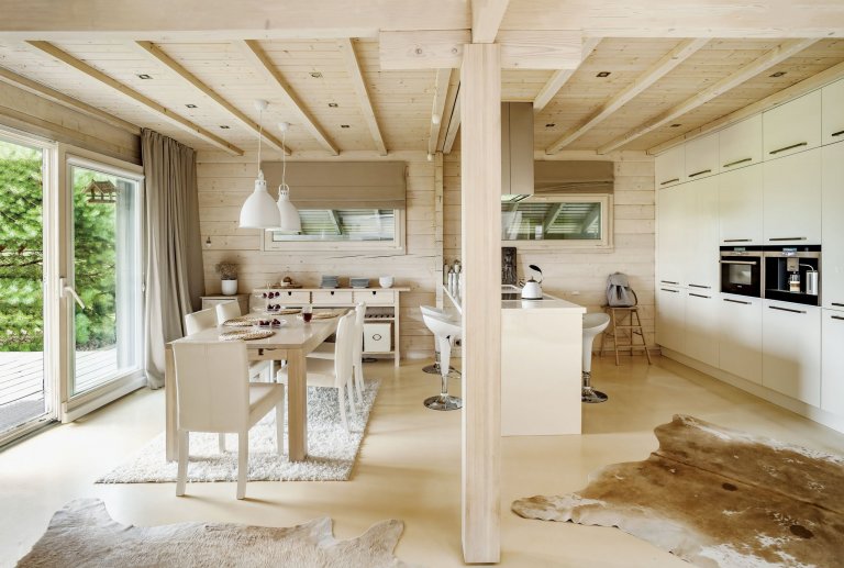 Duch Skandinávie je také viditelný uvnitř. Dřevo na stěnách i stropech je bělené, takže téměř září. Podlahy jsou ve stejném odstínu. Aby nic nenarušovalo dřevěnou tvář interiéru, v kuchyni i koupelně jou použity pásy průhledného tvrzeného skla namísto kachliček. Realizace tohoto nápadu ale nebyla údajně snadná, protože dřevo postupně pracovalo.