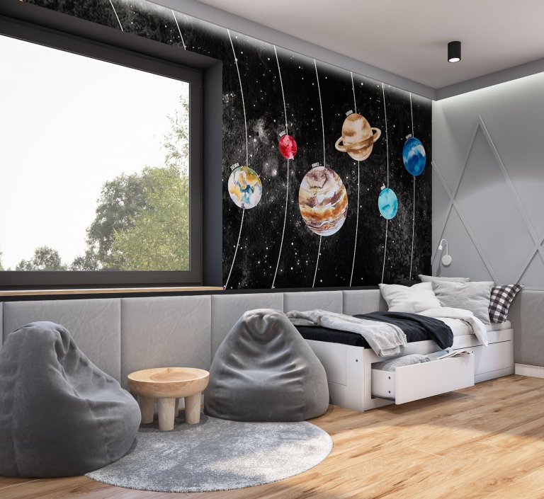 Moderní dům poskytuje svým obyvatelům otevřené prostory plné světla a designu. Zaujmou v něm netradiční závěsná svítidla, designové odkládací plochy, žaluzie i až na zem splývající závěsy. Pohledu návštěvníků neuniknou ani originální obrazy či zajímavé řešení dětského pokoje, který působí jako soukromé planetárium. Interiér je zařízen v minimalistickém stylu, a tak v něm mohou plně vyniknout použité materiály, tvary a barvy. Jednou z nejkrásnějších ozdob tohoto bydlení jsou pak výhledy na koruny vzrostlých stromů.