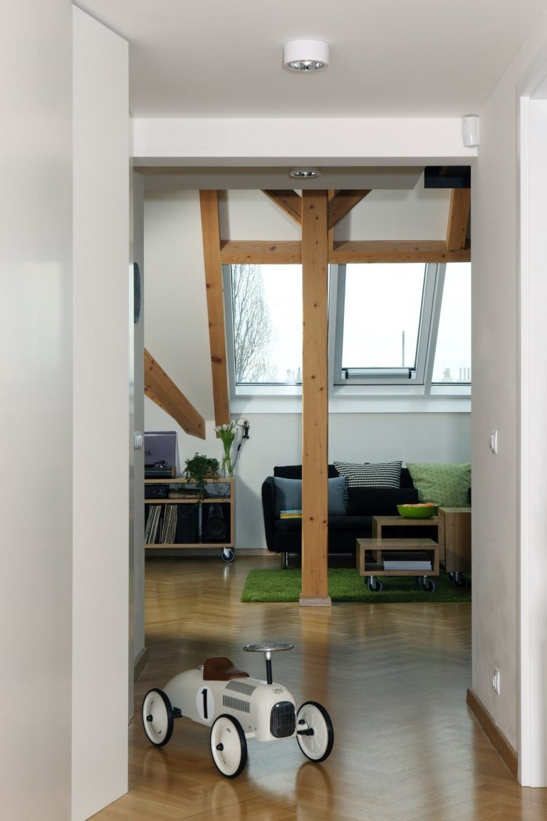 Dominantními prvky celého bytu jsou trámy krovu, převýšení jednotlivých místností a šikminy, se kterými lze velmi dobře pracovat. Architektka pracovala se třemi základními myšlenkami (design – standart – originál), a skloubila tak levnější – sériově vyráběný nábytek s designovými i klasickými kousky. Součástí interiéru je i autorský, na míru vyrobený nábytek, například: jídelní stůl, kuchyňský ostrůvek, zrcadla v ložnici, dětská postýlka, ad.).