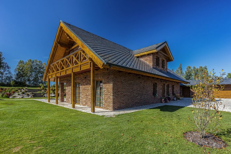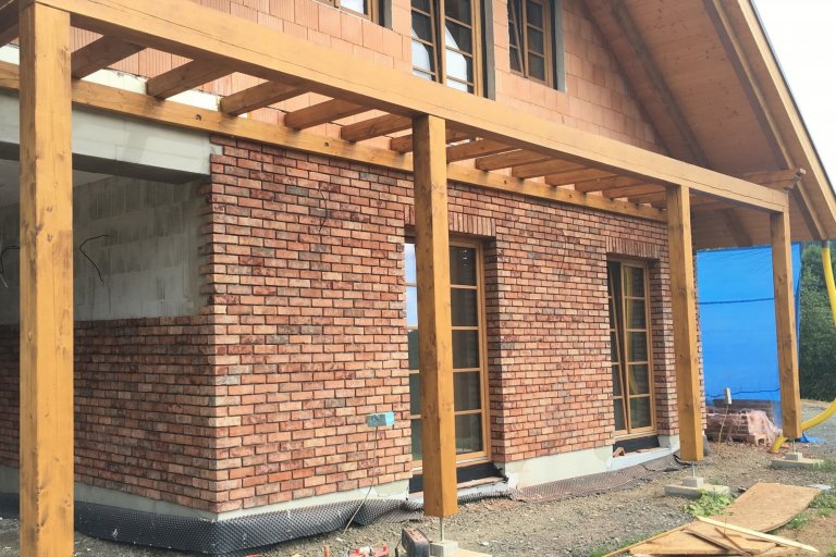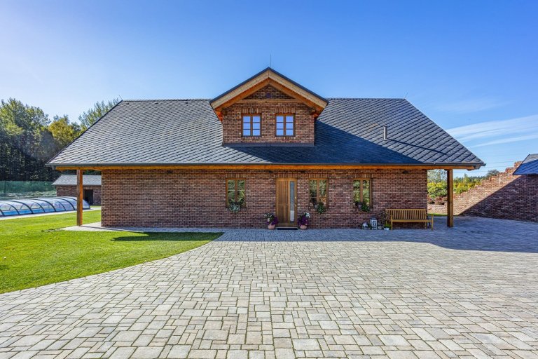 Pro stavbu jeho luxusního sídla byly využity převážně přírodní materiály. Rodinný dům postavený z pálených cihel krášlí břidlicová střecha a celá řada dřevěných doplňků. Majitel domu si přál, aby i fasádu domu zdobil přírodní materiál. Šanci zde dostaly cihlové obkladové pásky Cienna v kombinaci červené, krémové a tmavé barvy. Ty příhodně doplnila tmavá spárovací malta. Proto, aby majitel domu předešel možným komplikacím, které mohou nastat v důsledku neodborné montáže cihlových obkladových pásků, svěřil celou realizaci do rukou odborníků. Majitel domu byl s jejich prací nadmíru spokojen, a tak je brzy požádal také o obložení opěrné zdi a garáže. Obdobnou proměnou brzy prošel i čerstvě postavený zahradní domek, a celé venkovské sídlo se tak odělo do jednotného hávu. Dnes působí velice harmonickým a příjemně rustikálním dojmem. Mnohem více díky svému nynějšímu vzhledu zapadne do zahrady.