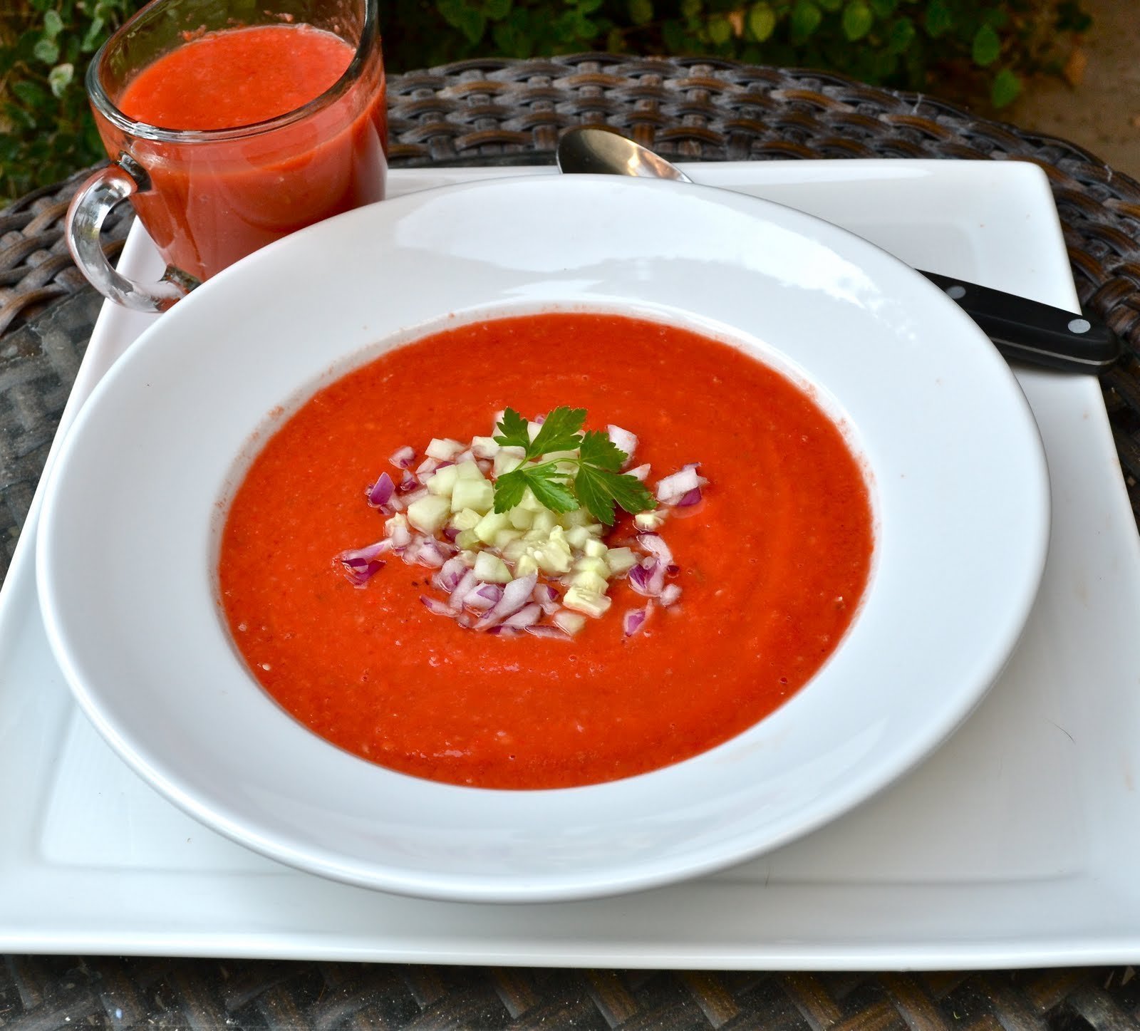 Nejdříve si připravte zeleninu, kterou budete na tuto osvěžující polévku potřebovat. Omyjte si zeleninu, papriku zbavte jádřinců a zelenou salátovou okurku oloupejte. Cibuli a veškerou zeleninu nakrájejte nadrobno. Rajčata také nakrájejte na drobné kousku a propasírujte přes hrubý cedník. Zbavíte se tak slupky, která často obsahuje velké množství chemie. Kousek bagety zalijte sherry octem, nebo vinným octem. Přidejte k nakrájené zelenině a rajčatům, rozmixujte tyčovým mixérem. Podle chuti můžete polévku dosolit nebo dosladit. Dejte ji na hodinu do lednice vychladit a pak můžete servírovat s opečenými chlebovými krutóny. Můžete podávat s kousky čerstvé zeleniny.