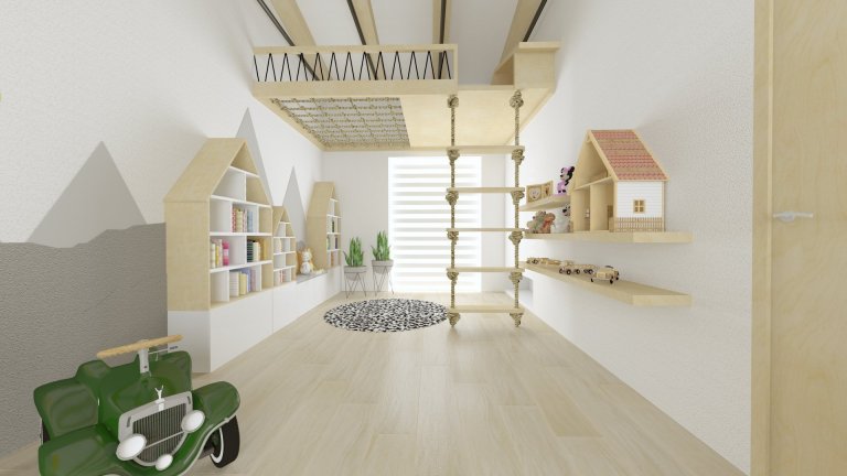 Do vyvýšeného poschodí se vylézá po žebříku. Boky žebříku jsou vyrobené z pevného lana a uprostřed jsou silnější prkénka, která jsou vyrobena z kvalitního a pevného dřeva. Po celém pokoji jsme navrhli dostatek odkládacích prostoru v zajímavém provedení pro hračky, knížky a mnoho dalšího co je pro děti důležité. Na druhé stráně se nachází dlouhé praktické tři police, které jsou vyrobené z lamino desek, na které si děti mohou pokládat své hráčky.