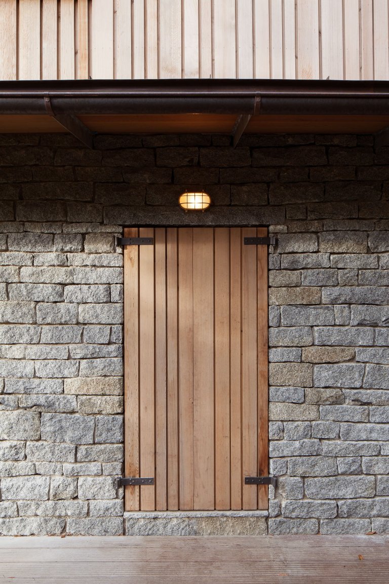 Ke stavbě horské chaty byly využity primárně přírodní materiály jako kámen a dřevo. Pro obložení soklu posloužily masivní štípané kvádry ze žuly, pro obložení fasád cedrové dřevo, zatímco v interiéru hraje prim smrkové. Dřevěné povrchy fasád budou postupem času přirozeně patinovat, a horská chata tudíž plynule vroste do svého okolí. Co se týče střešní krytiny, tu představuje měděný plech s vějířovitě rozmístěným falcem. Pomocí tohoto řešení dochází k umocnění dojmu ze vzhůru rozšiřující se hmoty. V případě oken došlo k využití masivních lepených dubových profilů ošetřených olejovou lazurou.