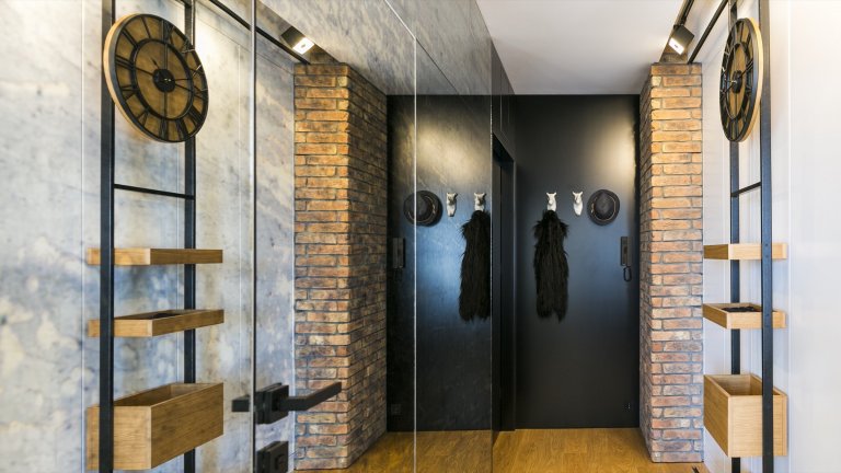 Dominantou interiéru je cihlová zeď, která vede podél celého bytu a je jakousi dokonalou kulisou pro další neobvyklé dekorace, jež v bytě najdeme. Architekti se při zařizování tohoto bytu zaměřili zejména na industriální styl bydlení, přičemž vše ladili v duchu minimalismu, kdy byt není zbytečně zahlcen nepotřebnými prvky. O příjemnou atmosféru se zde starají moderní a steampunk detaily.