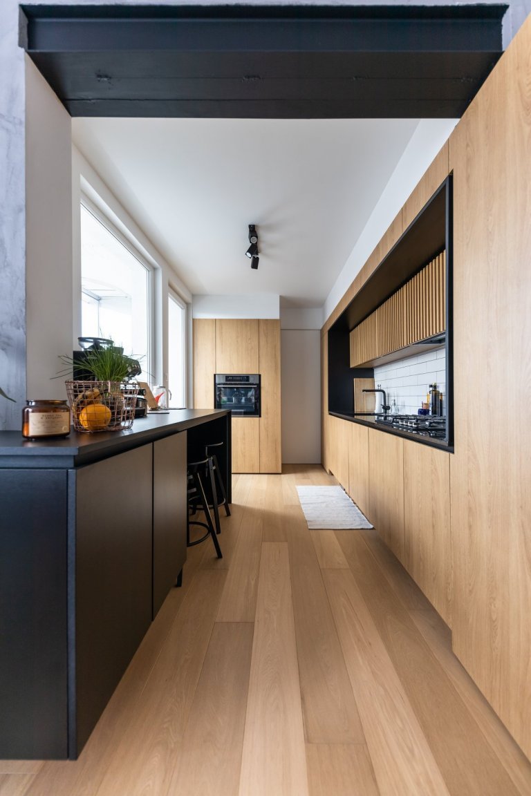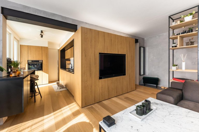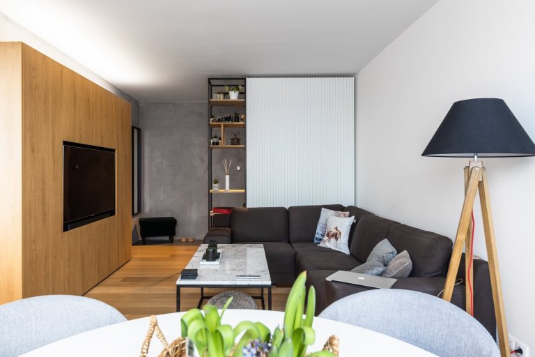 Klasické umakartové jádro není ničím, co by bytu přidalo na kráse. Proto architekti jako jádro bytu použili laminátové DTD desky s dubovým dekorem. Ty ladí k masivním dubovým parketám na podlaze. Dřevěných prvků je však v bytě daleko více. A to například regál dělící obývací pokoj od předsíně nebo parapety. Vytvořením dřevěného bloku jakožto jádra bytu architekti získali dostatek úložných prostor navíc. Součástí tohoto bloku je nejen televize, ale také samotná kuchyně. Prostor v bytě šetří také použité posuvné dveře. Dvířka u kuchyňských skříněk jsou řešeny pomocí vyfrézovaných žlabů sloužících místo klasických úchytek.