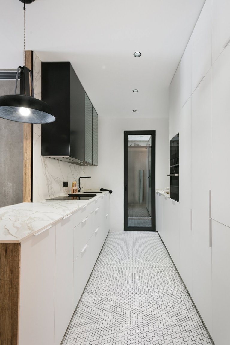 Na jídelní kout navazuje kuchyně. Ta je zde umístěna na skromném místě a tvoří jakousi dlouhou a úzkou místnost. Po obou stranách jsou skříňky vedoucí až ke stropu, takže je dostatek úložného prostoru zajištěn. Ikdyž není kuchyně velká, prostor pro přípravu pokrmů se zdá dostatečný. Na pracovní desky i obklady byl použitý bílý mramor. Podlaha je z praktického hlediska vyrobena z drobných kachliček a zvolena ve světlém odstínu.