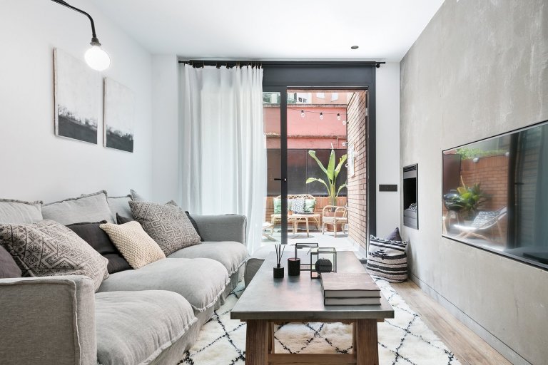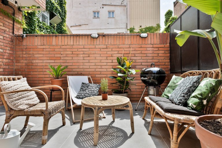 K bytu náleží i kouzelný dvorek s cihlovou zdí a skvělým posezením. Za letních večerů si majitelé mohou užívat grilování s přáteli nebo si zde mohou vychutnat svou ranní kávu. Nemohou zde chybět rostlinky v květináči. K posezení slouží proutěná lavice a křesílka. V tak velkém a rušném městě, jako je Barcelona, jsou byty se soukromým dvorkem přímo požehnáním. Člověk tak může alespoň na chvíli uniknout od ruchu tam venku.