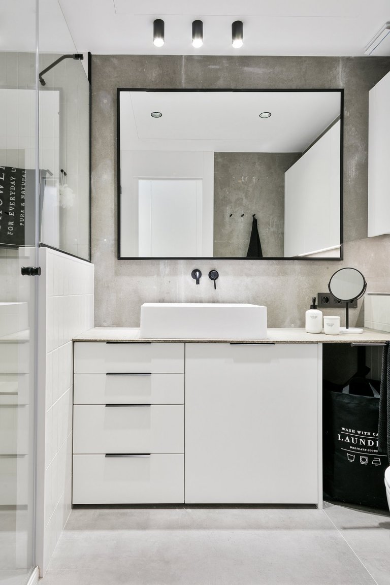 Byt je zajímavě rozčleněn. Kuchyně otevřeně přechází v jídelnu a obývací pokoj, ze kterého je možné vejít na malý dvorek. Na stěnách se opakuje šedá výmalba imitující syrový beton průmyslových staveb a střídá se s bílými nátěry. Podlaha je dřevěná a kontrastuje tak s chladnými barvami v celém prostoru. Společenská část bytu je od soukromí ložnice oddělena pouze zástěnou, bez dveří. Z jedné strany zástěny je ustaven jídelní stůl se čtyřmi židlemi, ze strany druhé se schovávají vestavené skříně.