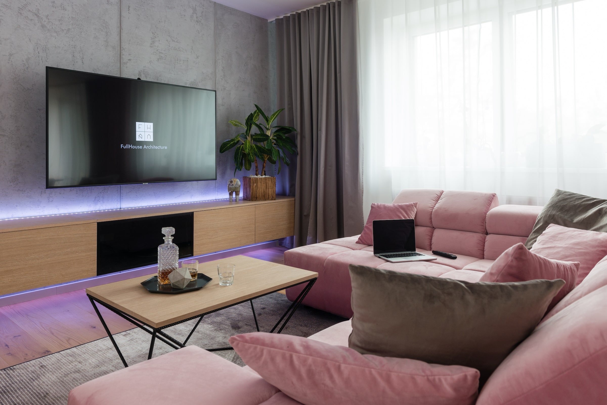 O ženskost bytu se stará pudrově růžová barva, se kterou se můžeme setkat jak na sedačce, tak i na závěsech či židlích. V kuchyni hraje velkou roli i černá barva, která v kombinaci s bílou působí nesmírně elegantně. Za dominantní, avšak mírně neobvyklý prvek v interiéru, můžeme považovat kuchyňský ostrůvek potažený betonovou stěrkou, který působí díky svému tvaru mírně dynamicky. U obývacího pokoje se můžeme setkat s betonem v podobě betonové stěrky nacházející se u obývací stěny, kterou zjemňují růžové a fialové tóny u textilií.