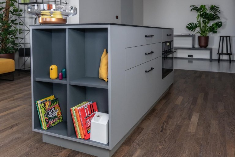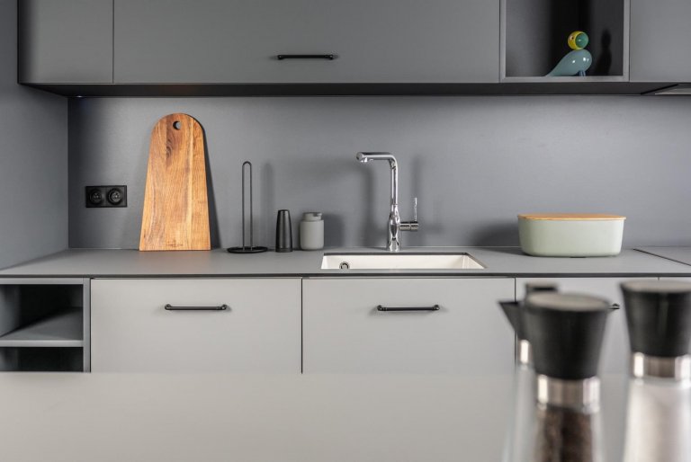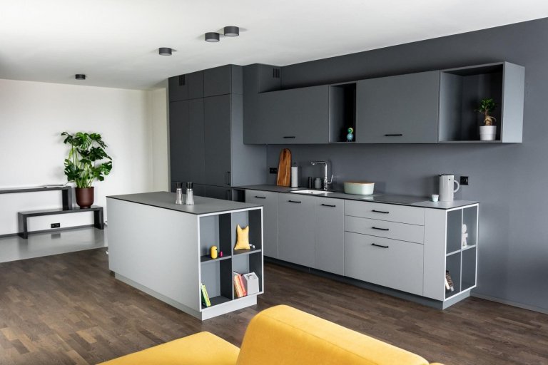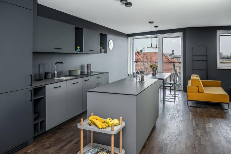 Malá kuchyně vyrobená na míru se skvěle hodí k minimalistickému stylu, ve kterém je interiér zařízen. Kromě kuchyňského nábytku vyrobeného na zakázku je k dispozici také elegantní kuchyňský ostrůvek, který slouží jako další úložný prostor, pracovní plocha a dokonce i jako bar, který poslouží pro rychlé snídaně. Na přání majitele neměla kuchyně interiéru dominovat. Designérka ji tedy nechala diskrétně splynout s okolím. Díky prostorným skříním bylo možné skrýt všechny spotřebiče. Na kuchyňskou část plynule navazuje jídelní část s moderním stolem pro čtyři osoby. Ten má sloužit celé rodině nejen ke společnému stravování, ale také k práci a ke studiu. Také v tomto prostoru hrají hlavní roli odstíny šedé barvy. Dramatičnost šedého pozadí stírá výrazný žlutý akcent v podobě modulární sedací soupravy. Intenzivní žlutá barva krásně kontrastuje s tmavými tóny a zahřívá konzervativní minimalistický interiér.