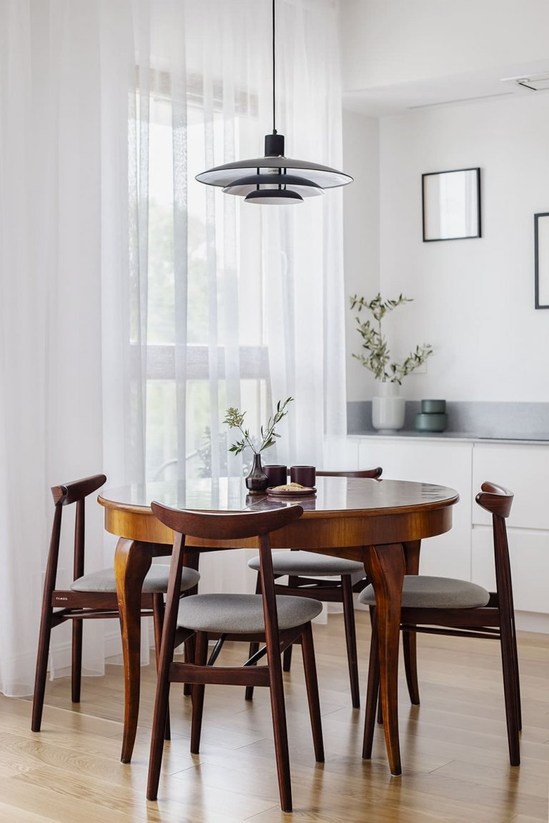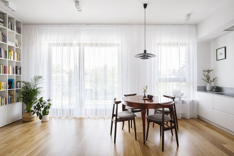 Prvek, který symbolicky odděluje kuchyňský kout od obývacího pokoje, je překrásný jídelní stůl obklopený židlemi. Vzhledem k tomu, že byl zvolen kulatý kus nábytku, nepůsobí v interiéru jako vizuálně ostrá bariéra. Retro styl stolu a jeho vysoce lesklá deska plaše ohlašují eklektickou orientaci celého interiéru. Pozadí pro obývací pokoj tvoří knihovna, která se nachází poblíž moderní šedé pohovky. Doplňuje ji průhledný konferenční stolek. Tento křehký kus vybavení dodává interiéru elegantní a moderní ráz. Perfektně si s ním rozumí designová polská křesla.